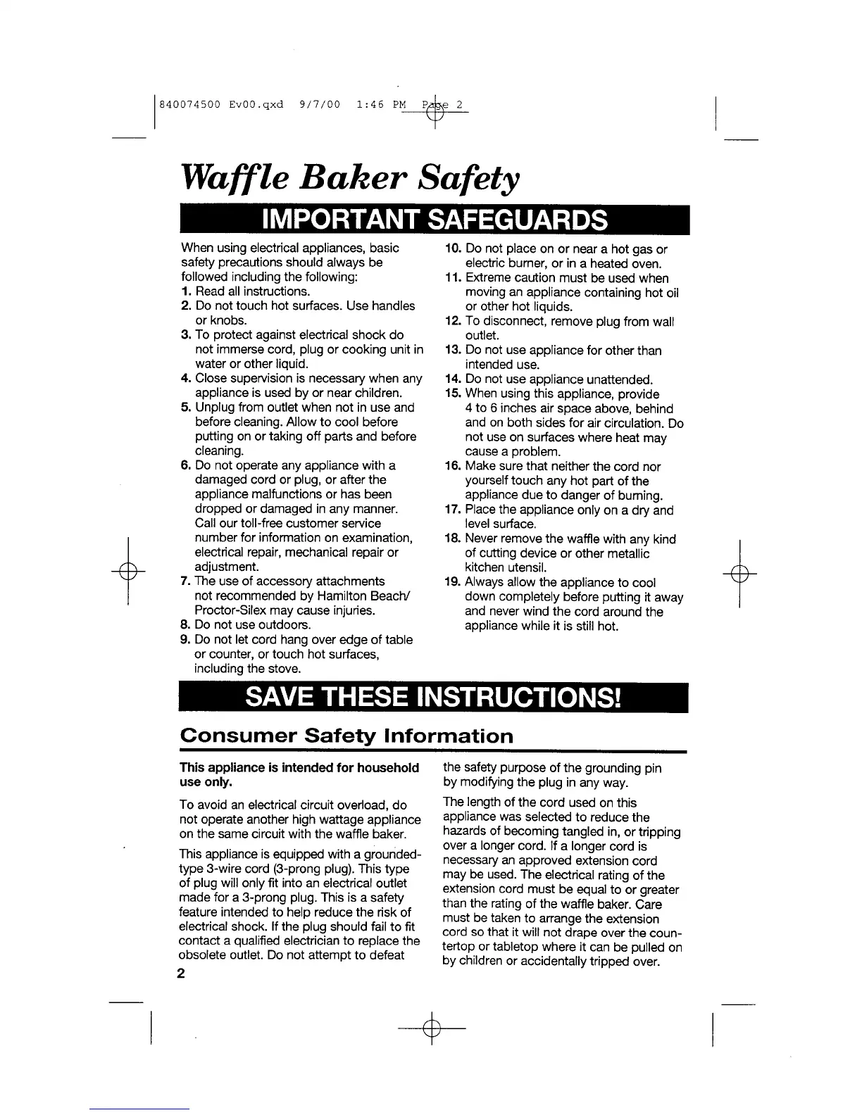 Hamilton Beach 26200 - Waffle Baker Safety; Important Safeguards; Consumer Safety Information