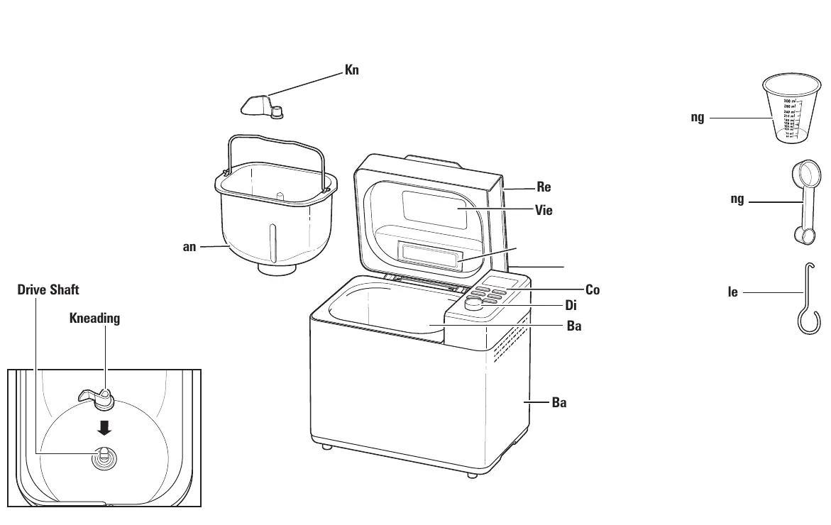 Before first use: Wash Bread Pan, Kneading Paddle, Measuring Cup,