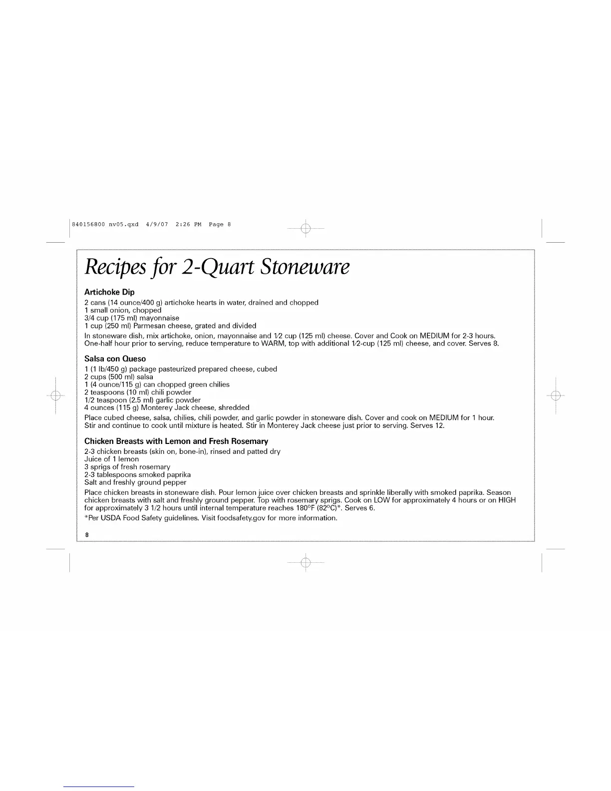 One-half hour prior to serving, reduce temperature to WARM, top with additional 1/2-cup (125 ml) cheese, and cover. Serves 8.