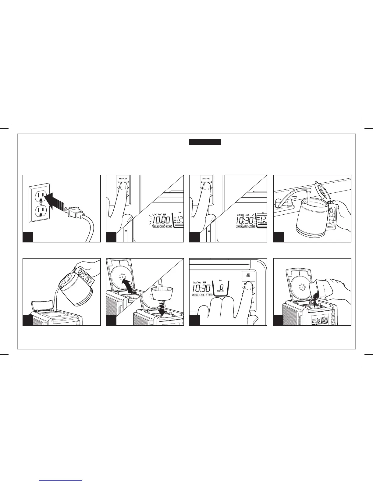 or PM. Wait for minutes to flash. Press TIME button to set current minutes. Set time will display. Add water to carafe.