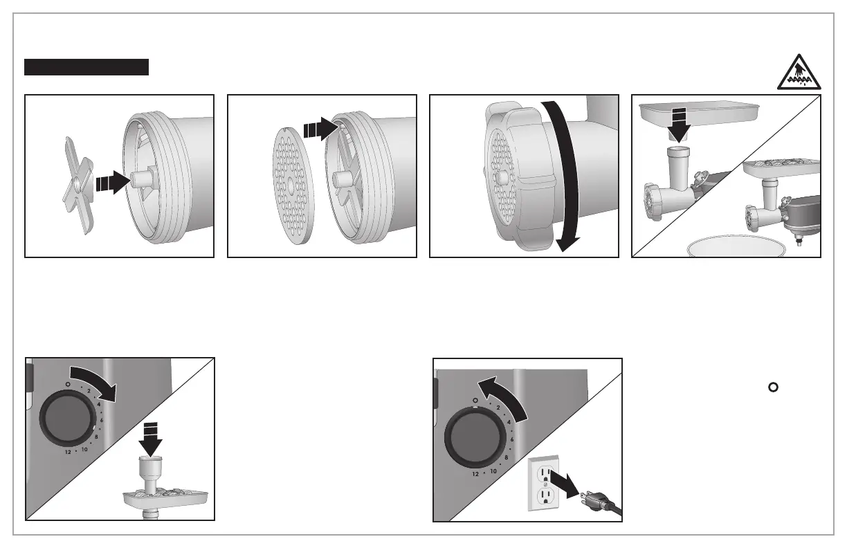 se retrouvant dans l’orifice du hachoir. Utiliser toujours le poussoir d’aliments. N’opérer jamais l’appareil sans que le plateau ne soit en place.