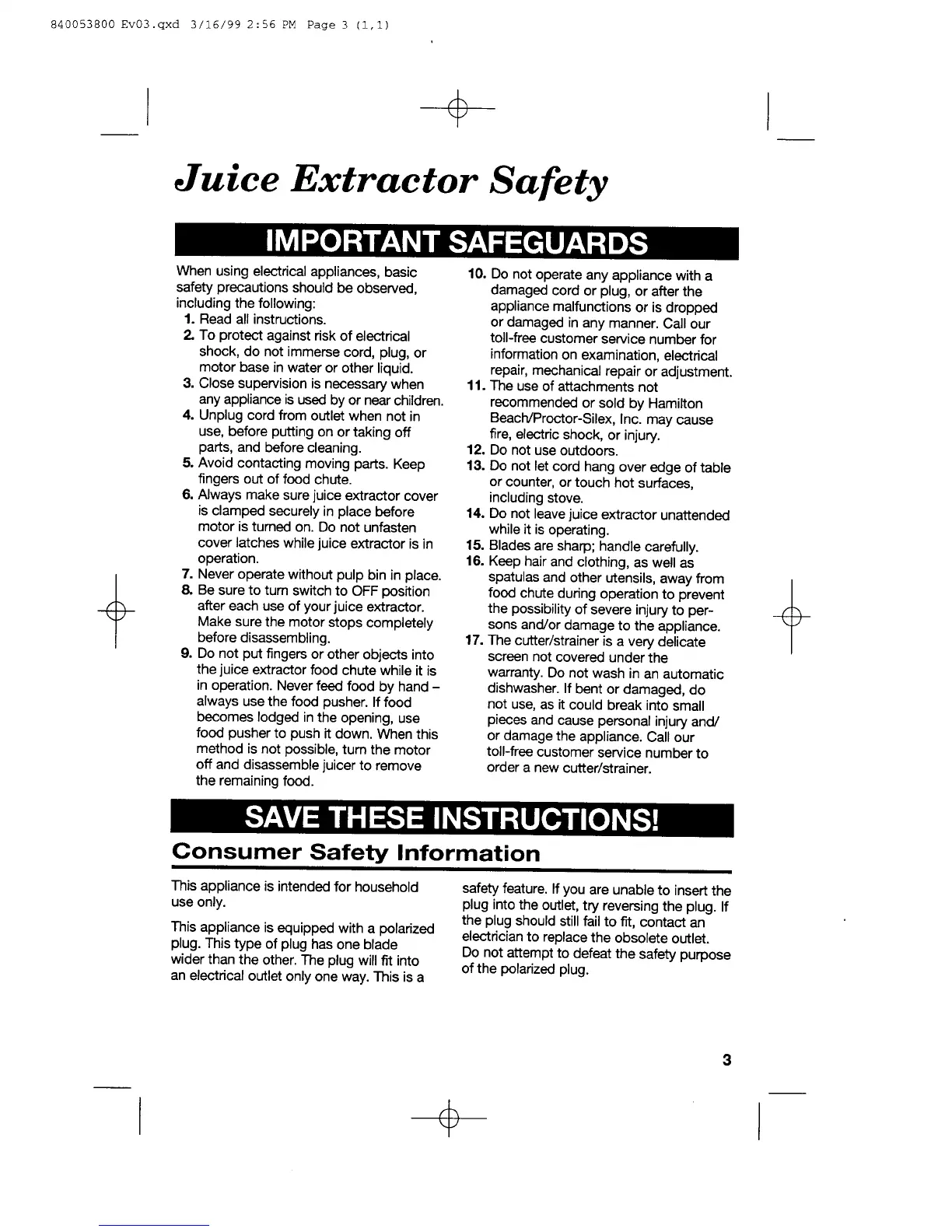 Hamilton Beach 67150 - Juice Extractor Safety; IMPORTANT SAFEGUARDS; Consumer Safety Information