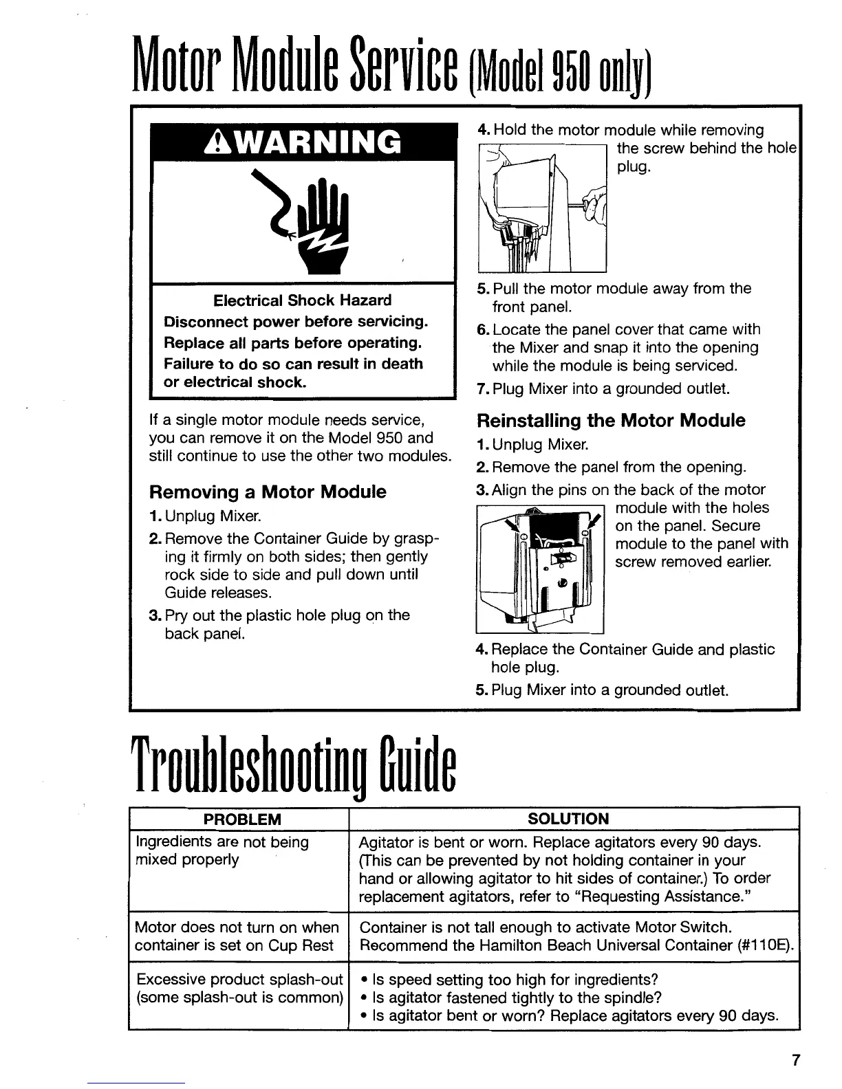 Hamilton Beach 936 - Motor Module Service (Model 950); Removing a Motor Module; Reinstalling a Motor Module