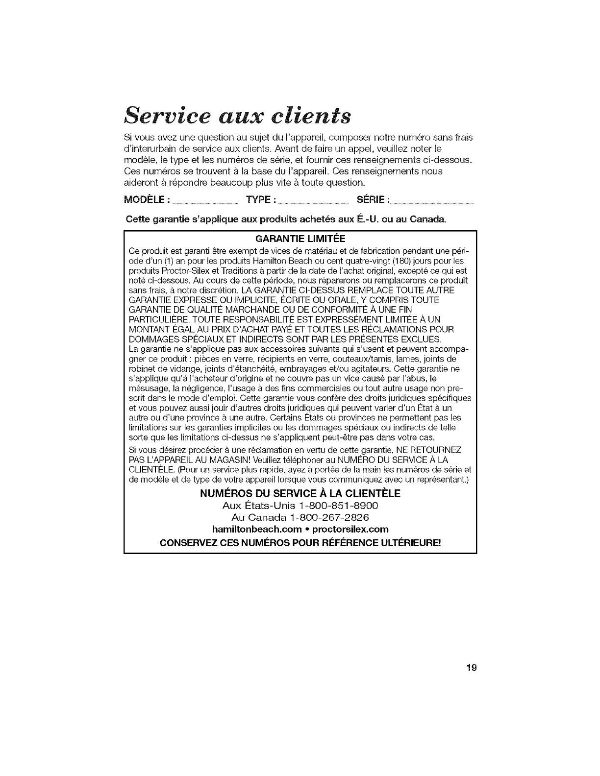 ode d'un (1) an pour les produits Hamilton Beach ou cent quatre-vingt (180) jours pour les