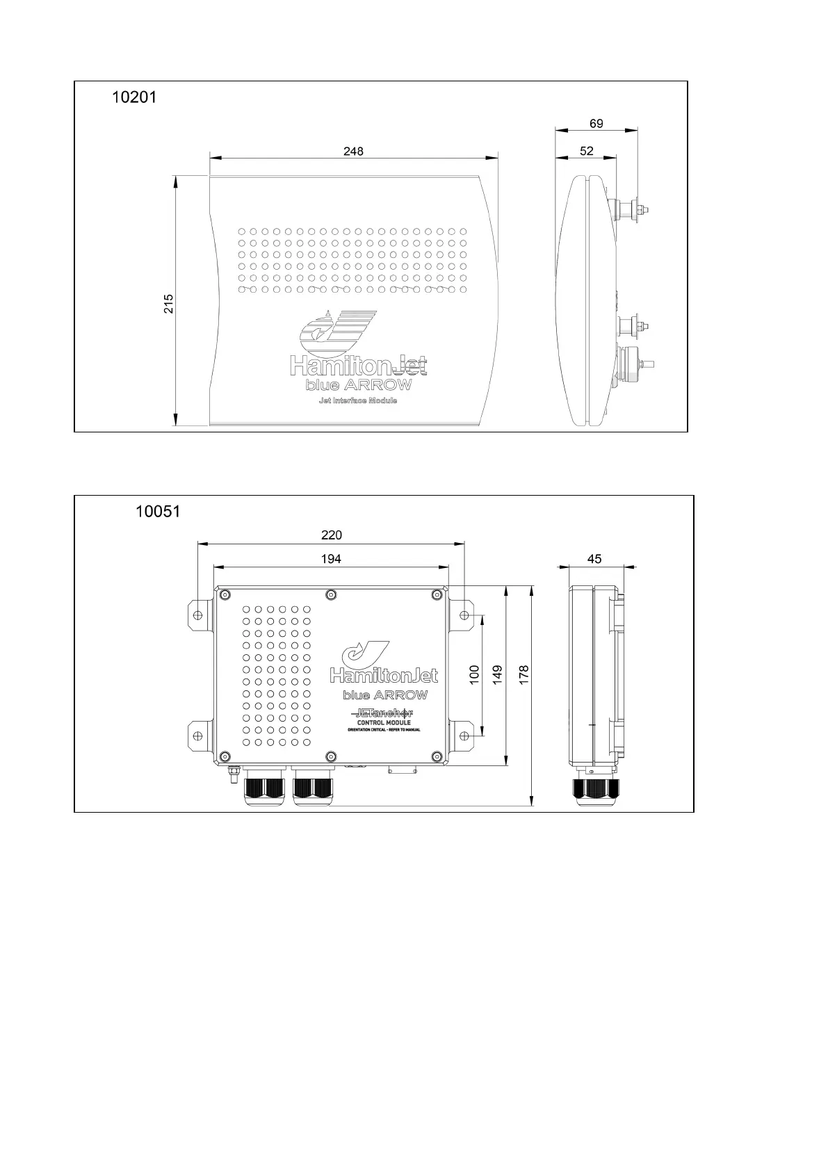 Figure 27: Engine interface module, JETanchor control module and external control interface module dimensions