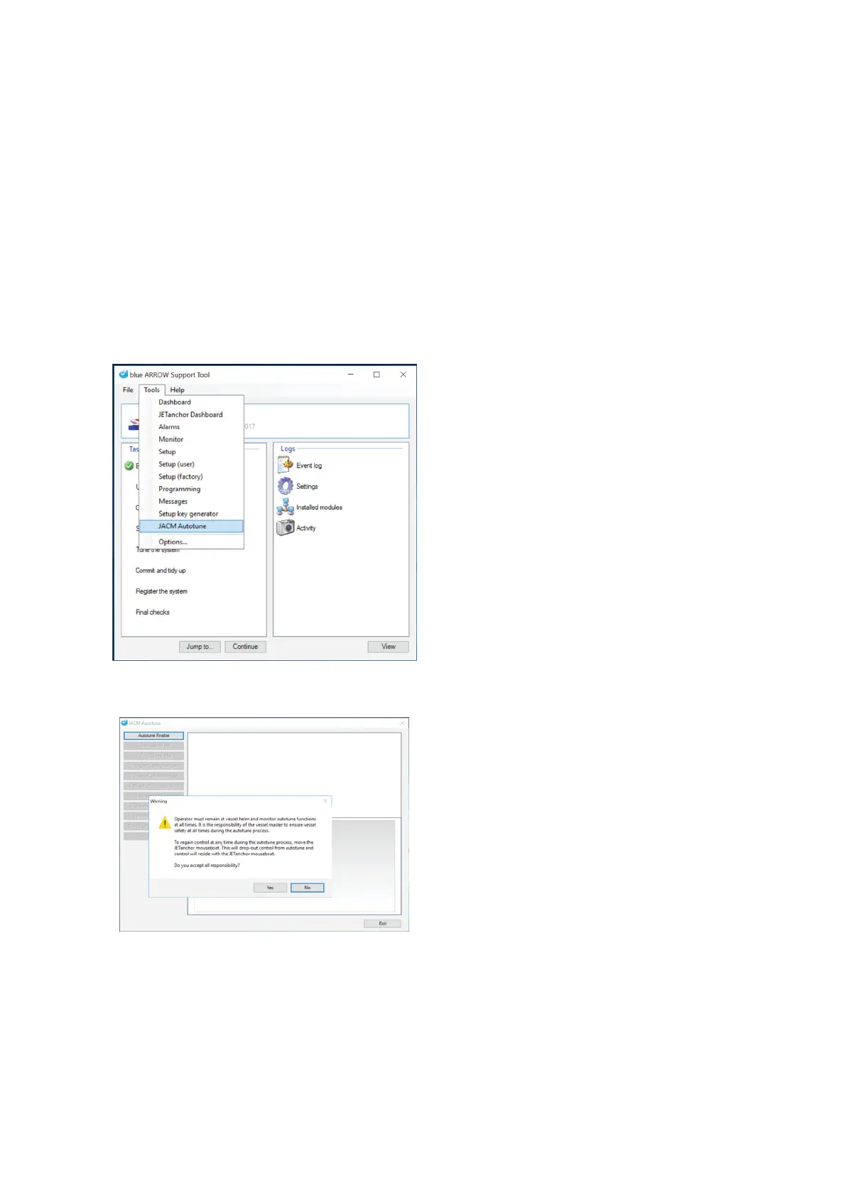 Confirm with the vessel master that it is safe to take control of the vessel and begin the auto tune