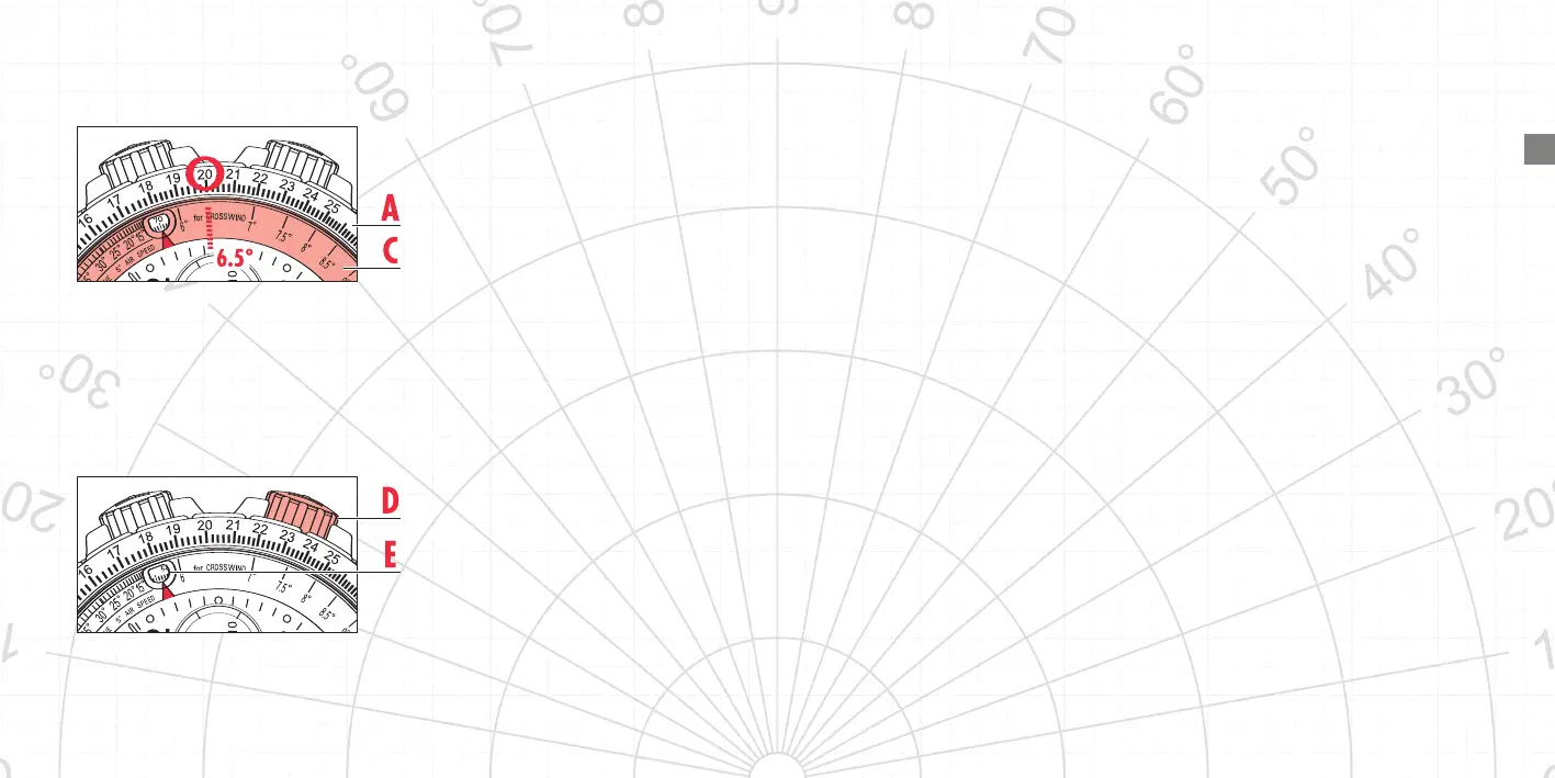 korrigierte Richtung (46,5°) kann über die Krone (D) auf dem unteren innen liegenden Drehring (E)