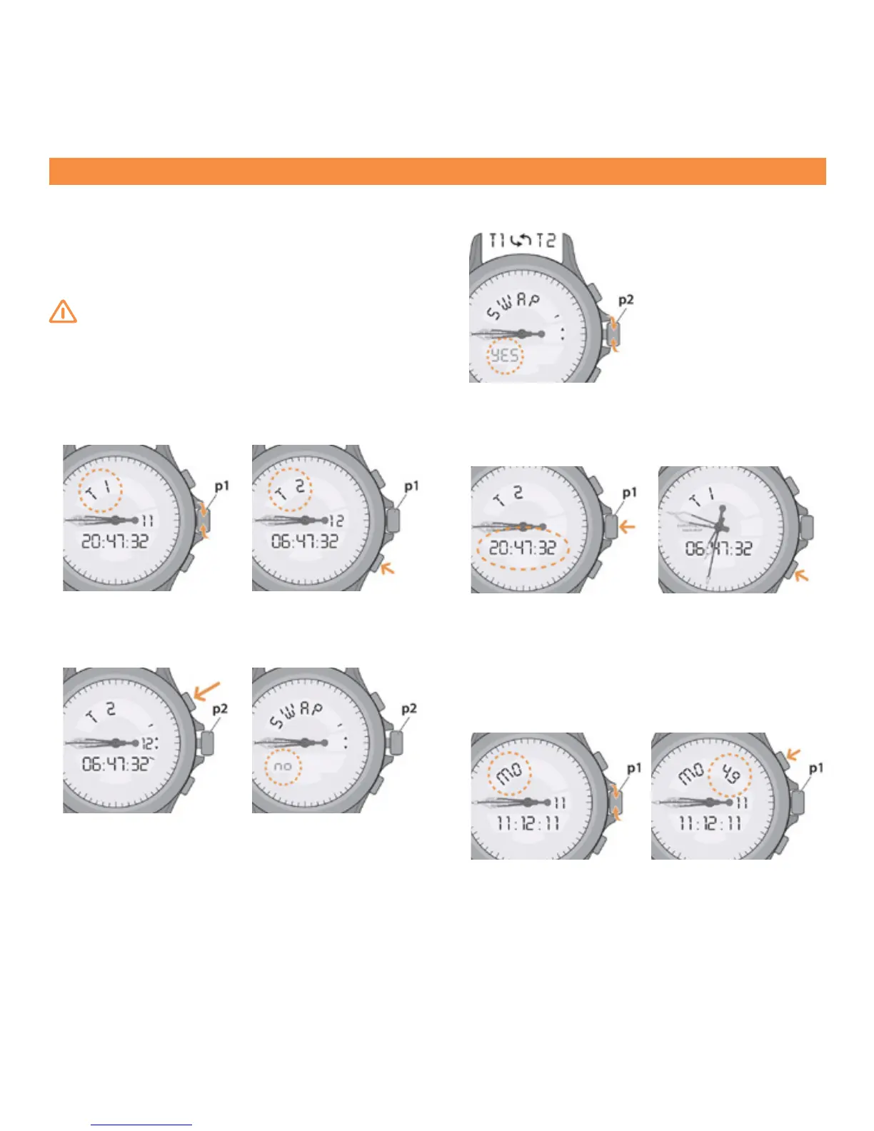 将表冠按回位置 (p1)。时区“T1”“T2”互换,