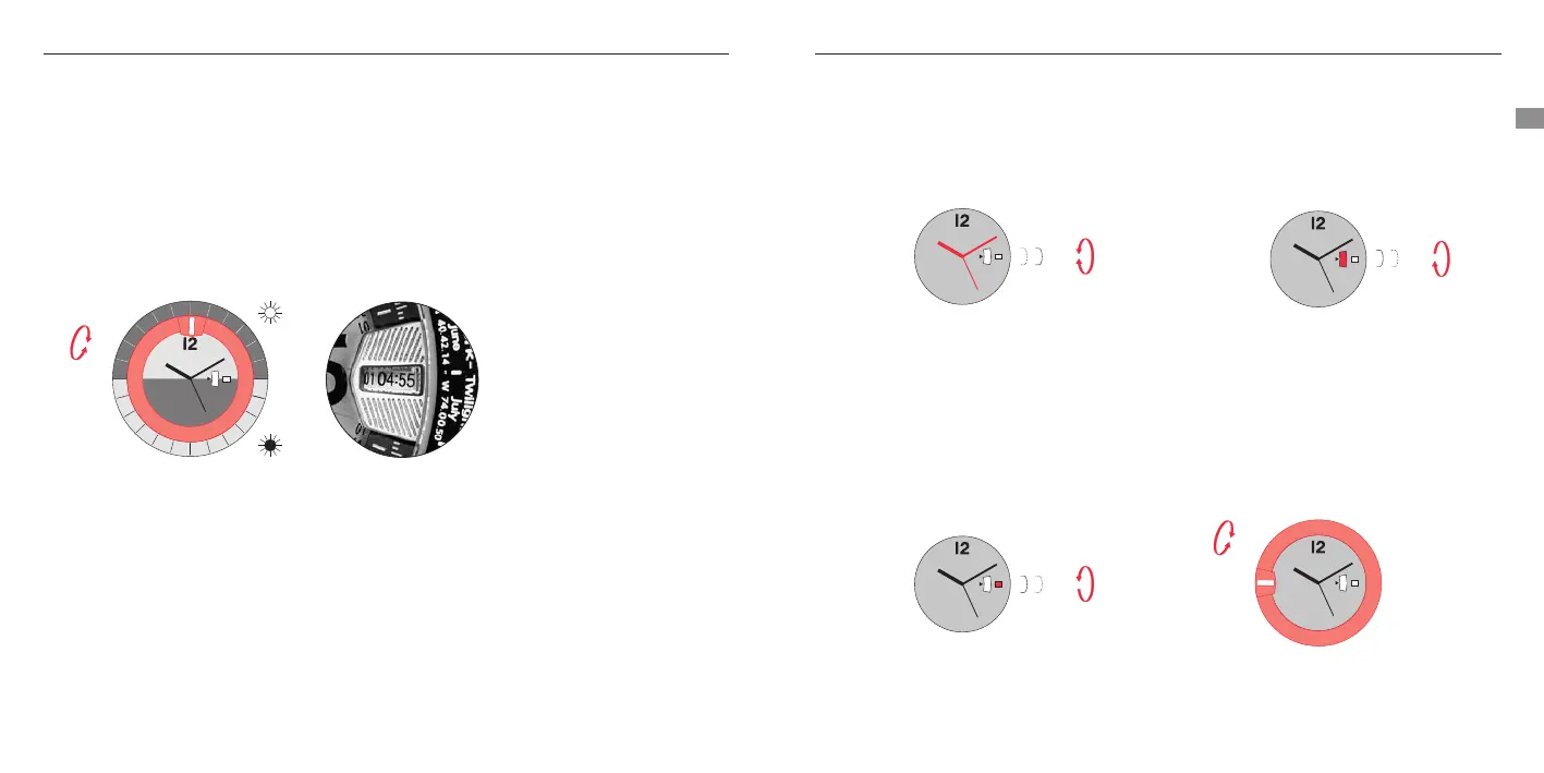 Drehen Sie zur Anzeige der Zeit der Dämmerung (Twilight End) die Krone bis das Sichtfenster des inneren