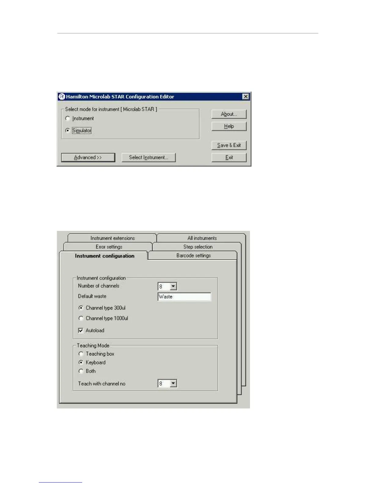 Click the Advanced button to access the instrument configuration screen. Different tabs are