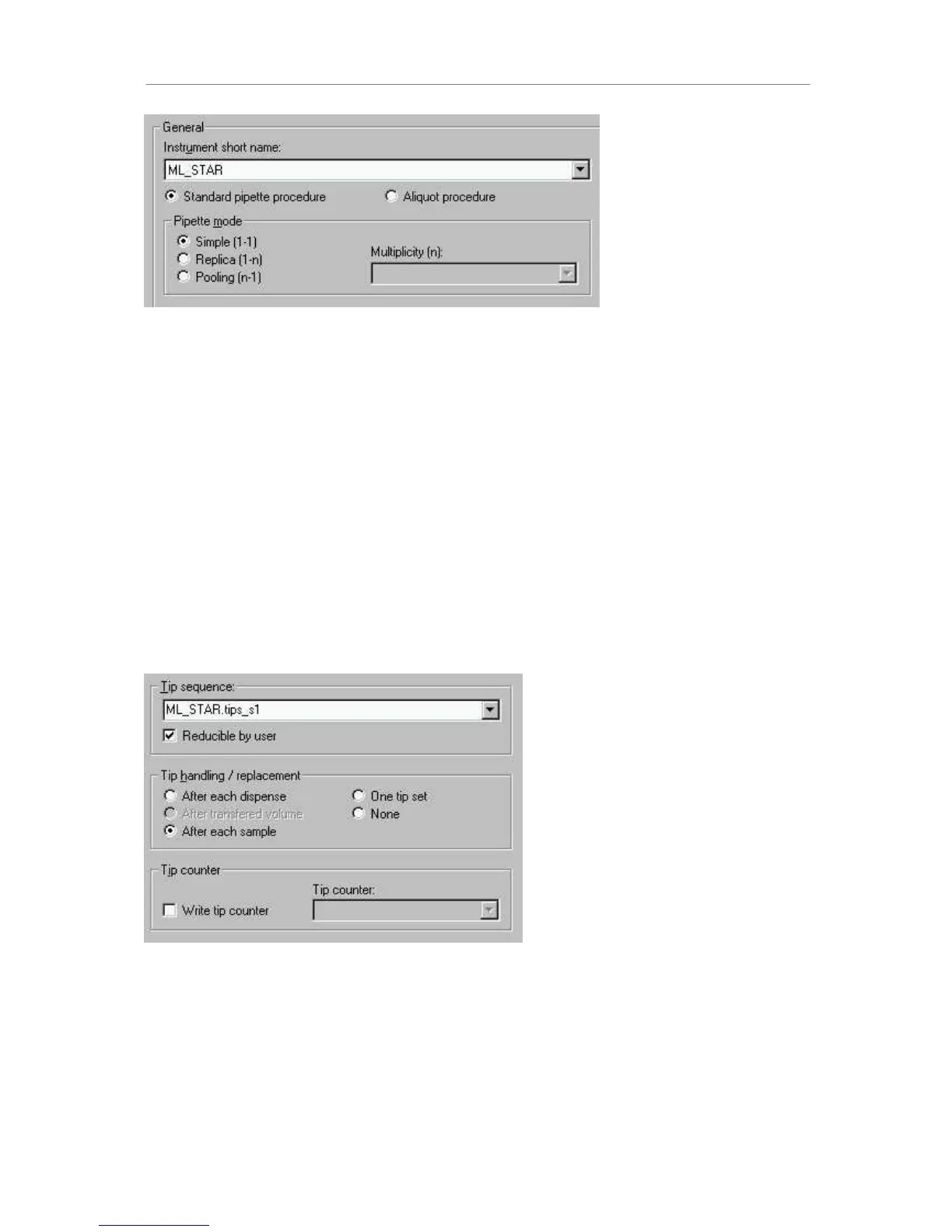 For the aliquoting procedure, the choices under pipetting mode are deactivated. Aliquoting