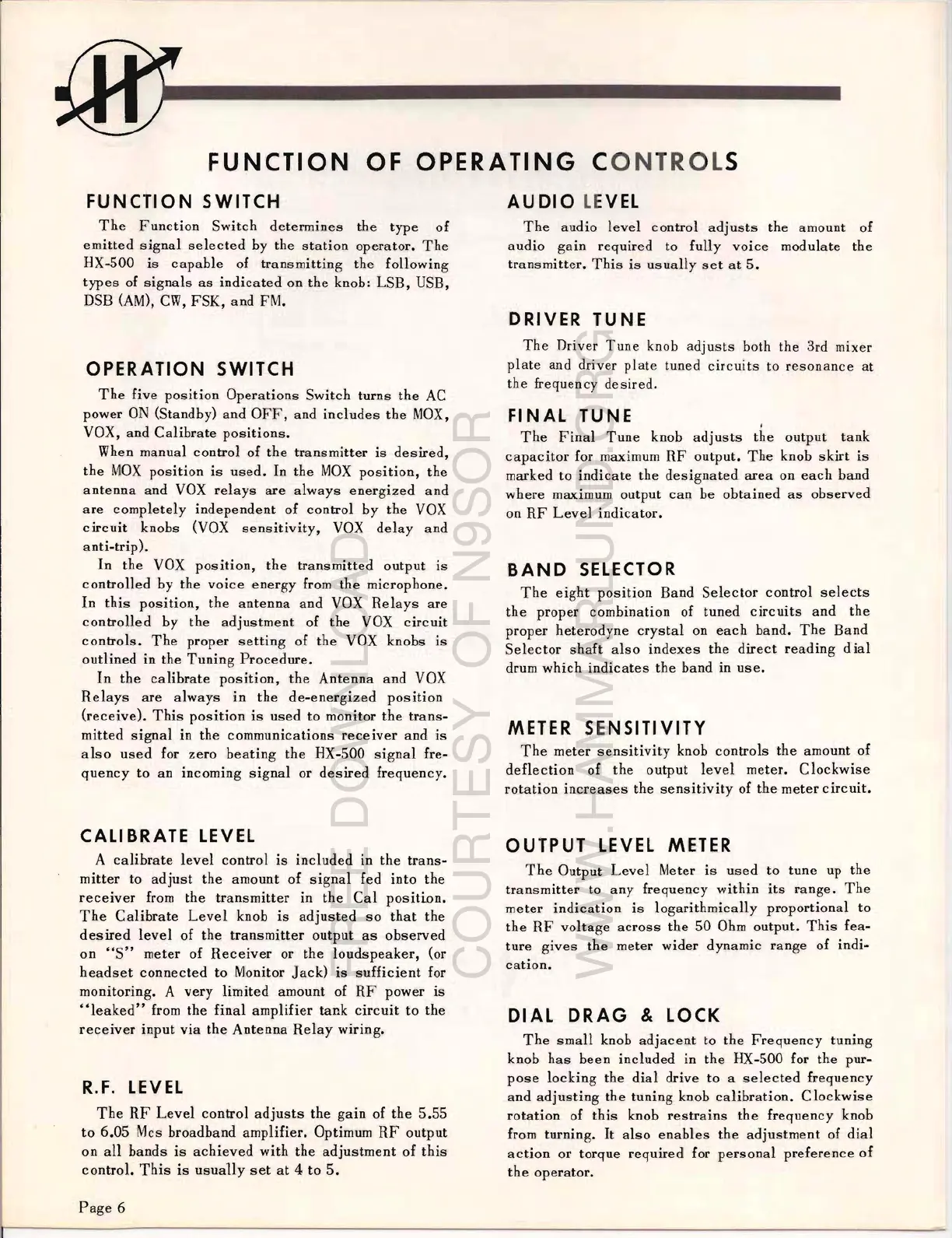 Hammarlund HX-50 - Function of Operating Controls; Control Descriptions