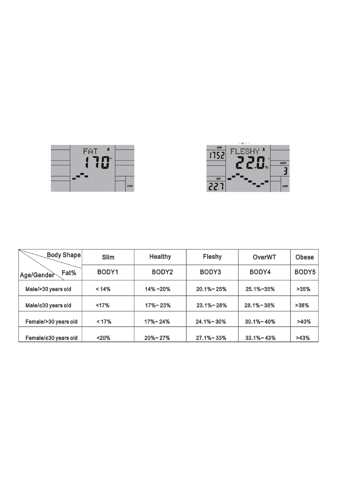 the contact pads. The test result are: FAT%, BMR(Basal Metabolic