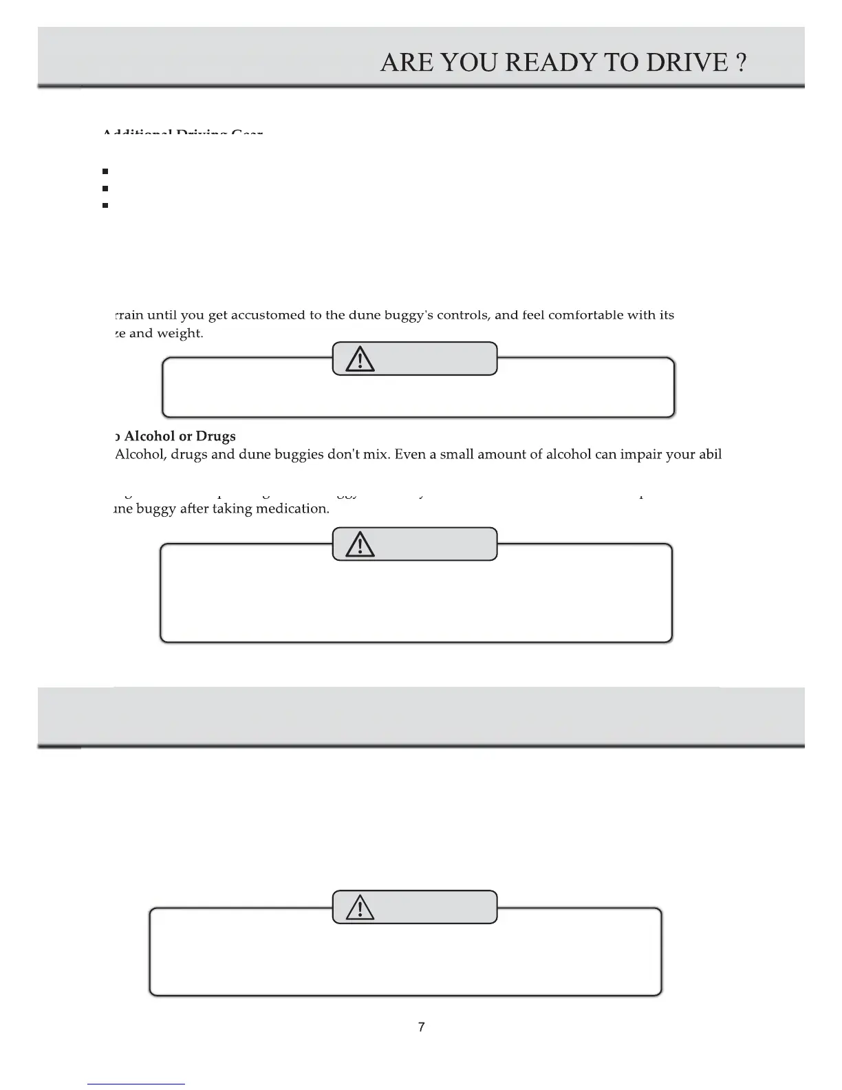 Never consume alcohol or drugs before or while operating this dune buggy.