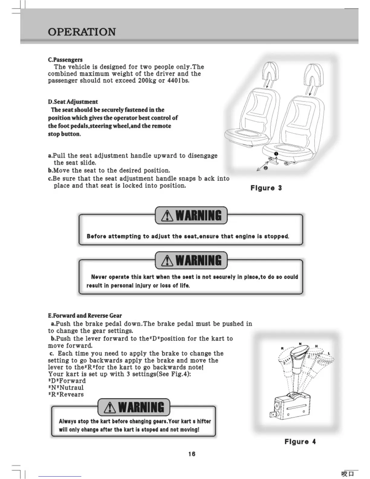 Hammerhead SS250 - Passengers; Seat Adjustment; Forward and Reverse Gear