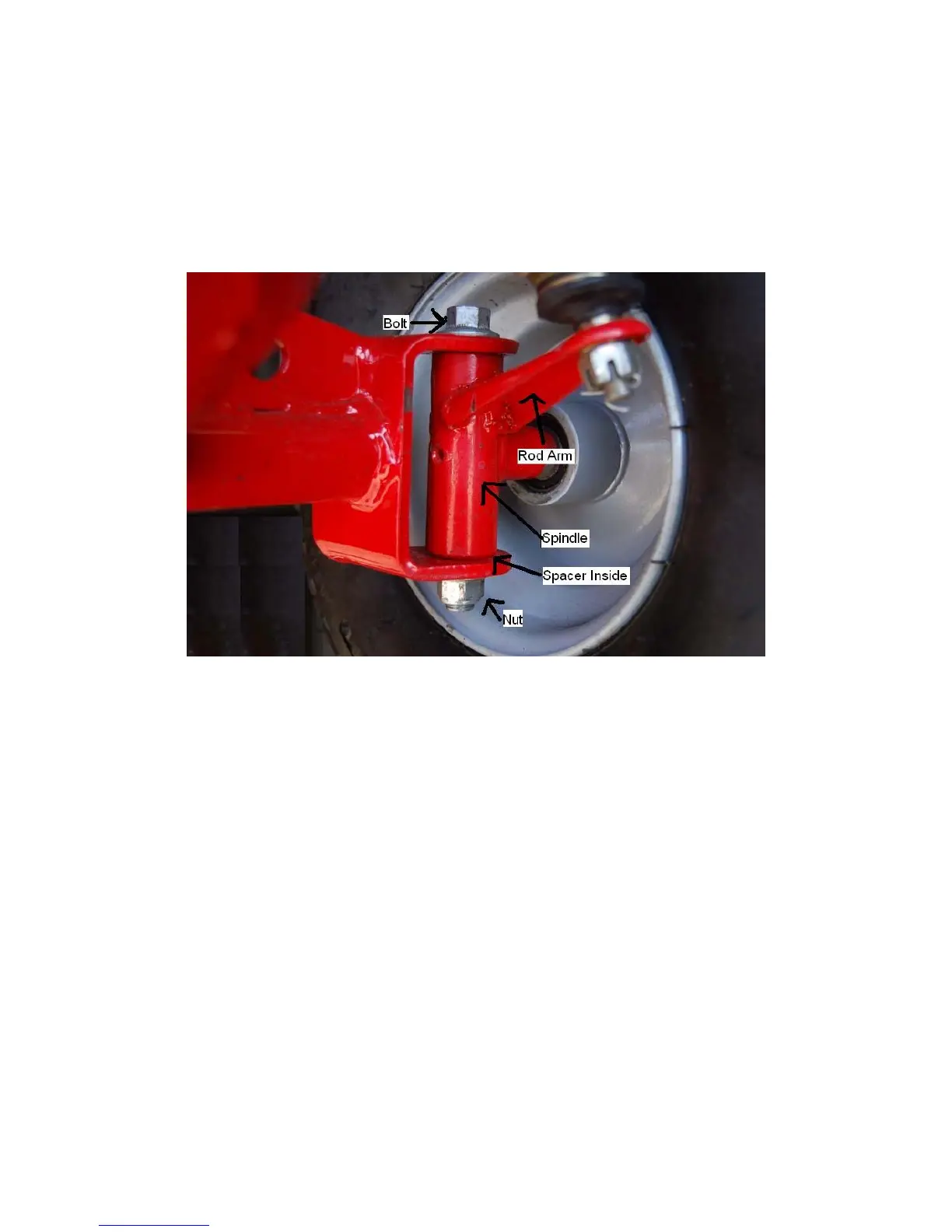 7) Attach front spindles to kart. Tie rod arm should be on the top side and facing