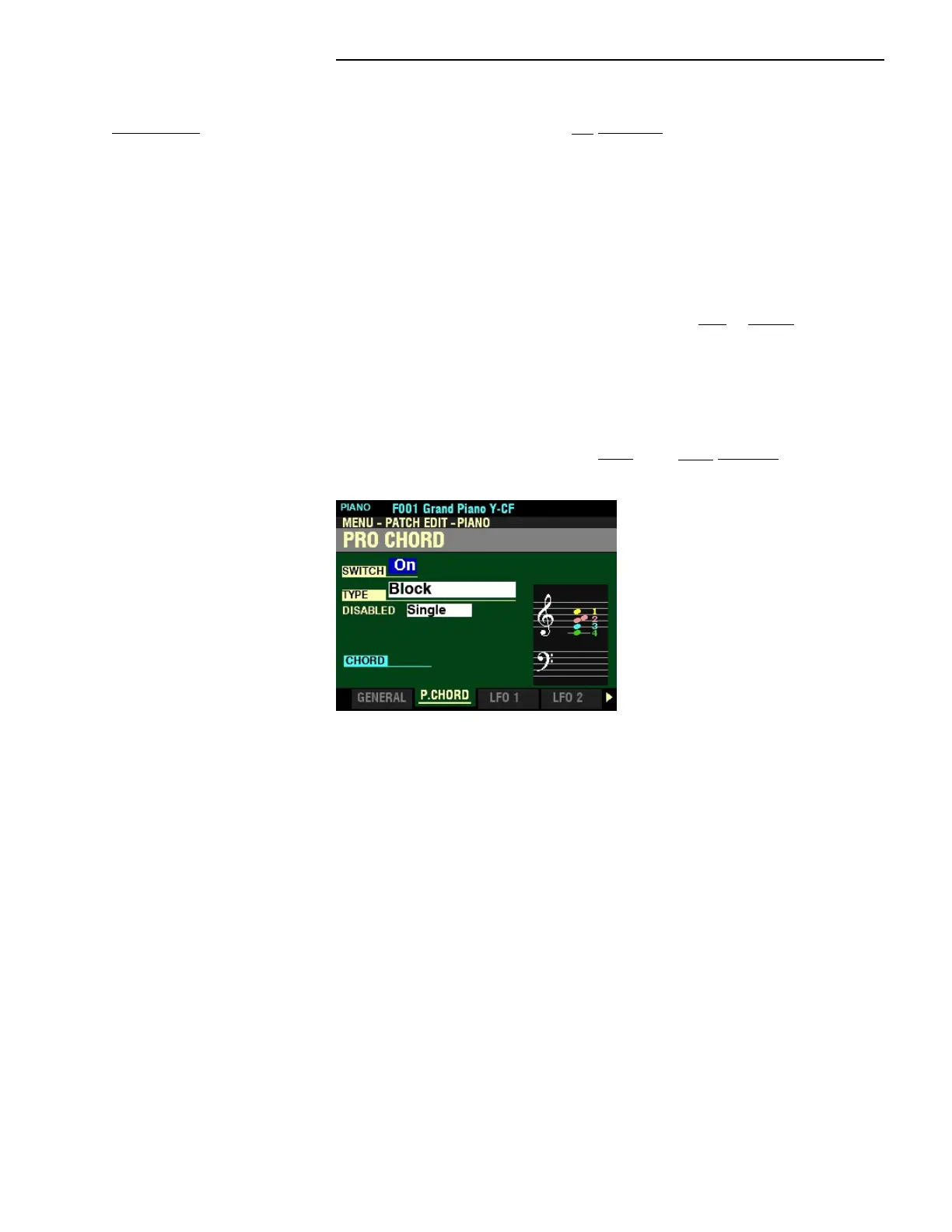 The instructions on the previous page apply to all of the PIANO / ENSEMBLE Patches with ProChord. Each