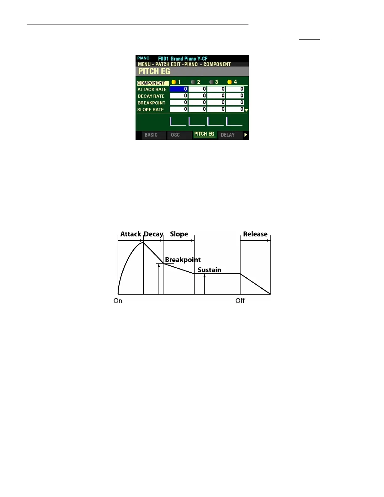 From the screen shown on the previous page, press the PAGE “u” button once. The PITCH EG Page