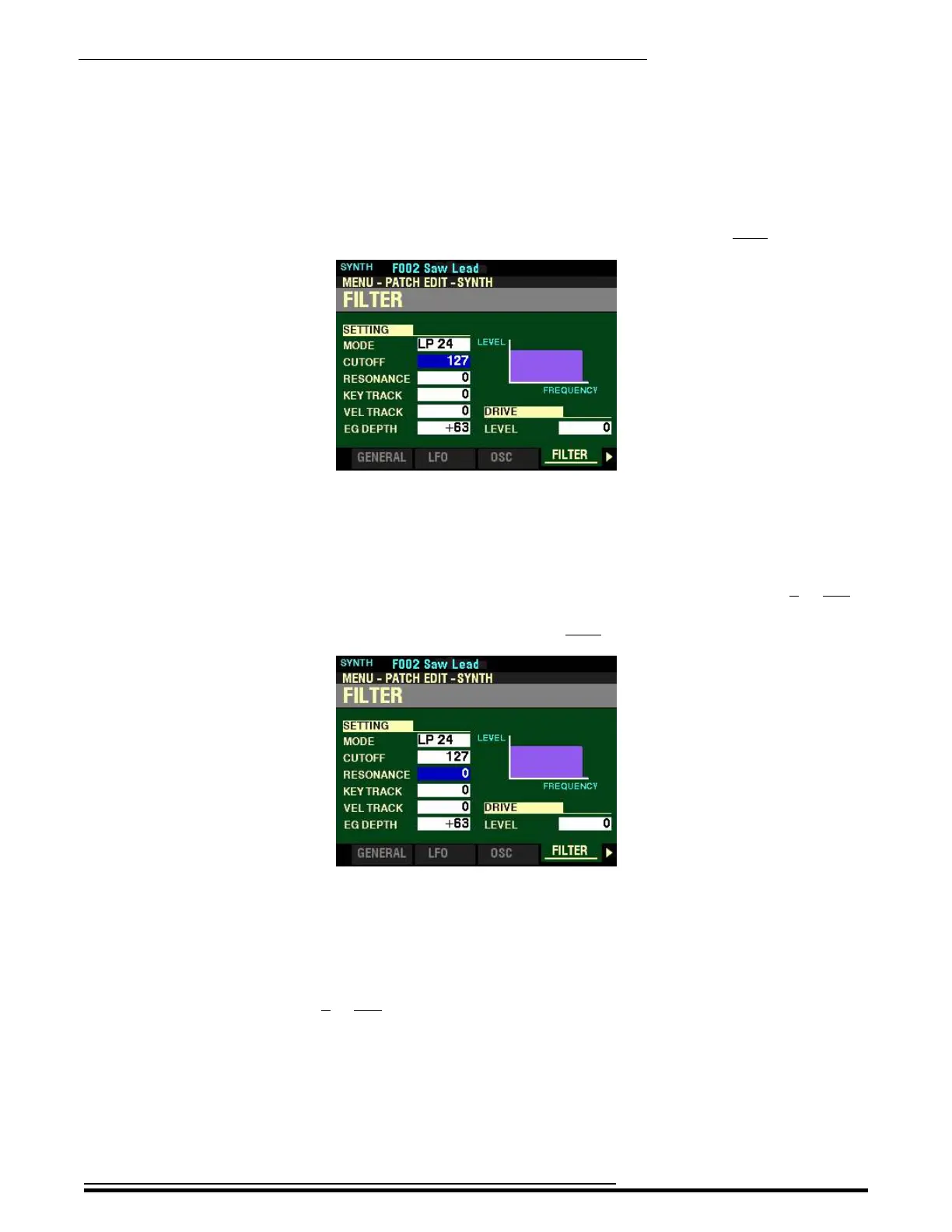 This Parameter allows you to adjust the Cutoff Frequency of the Filter. You can select from 0 to 127.