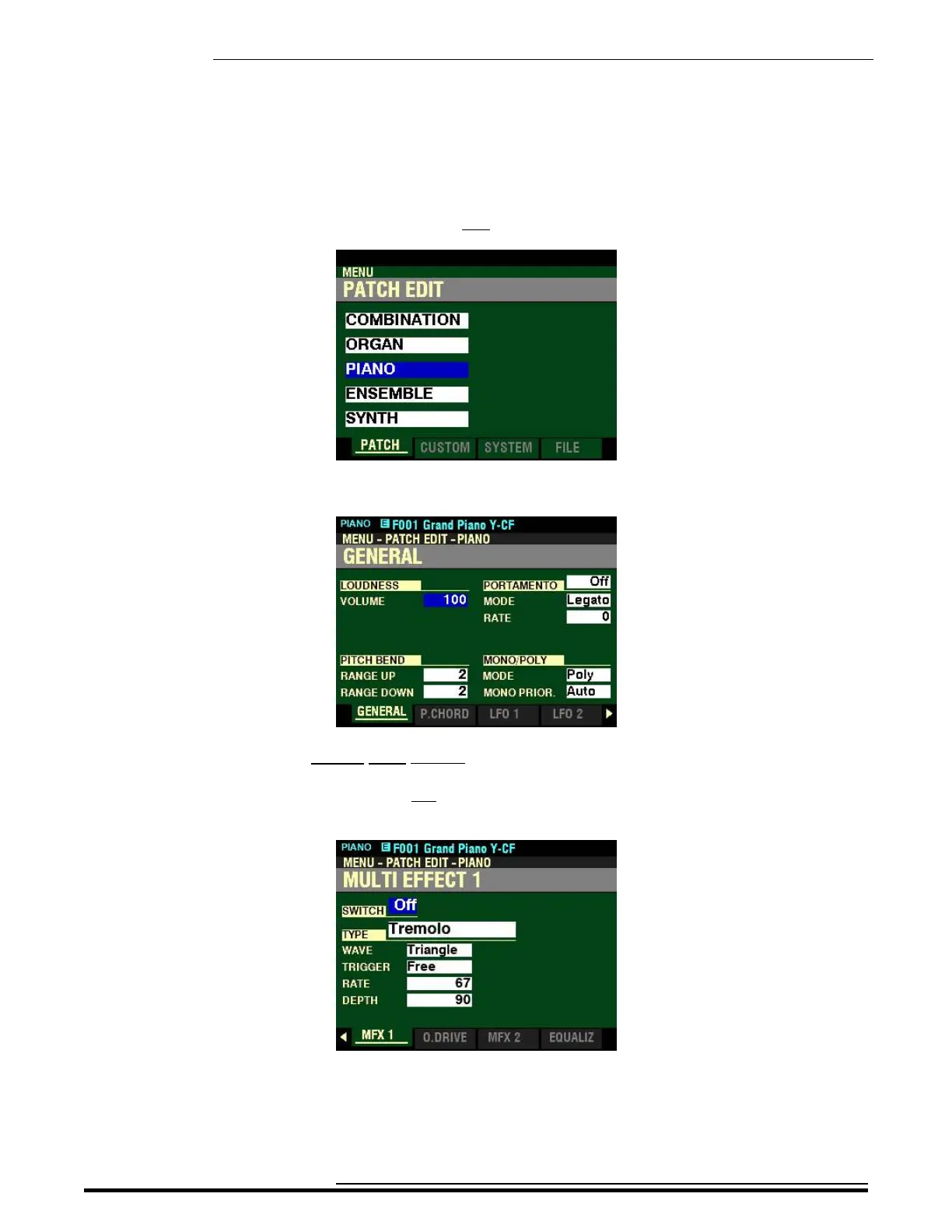 Page 1 of the PATCH EDIT -PIANO FUNCTION Mode should now display.