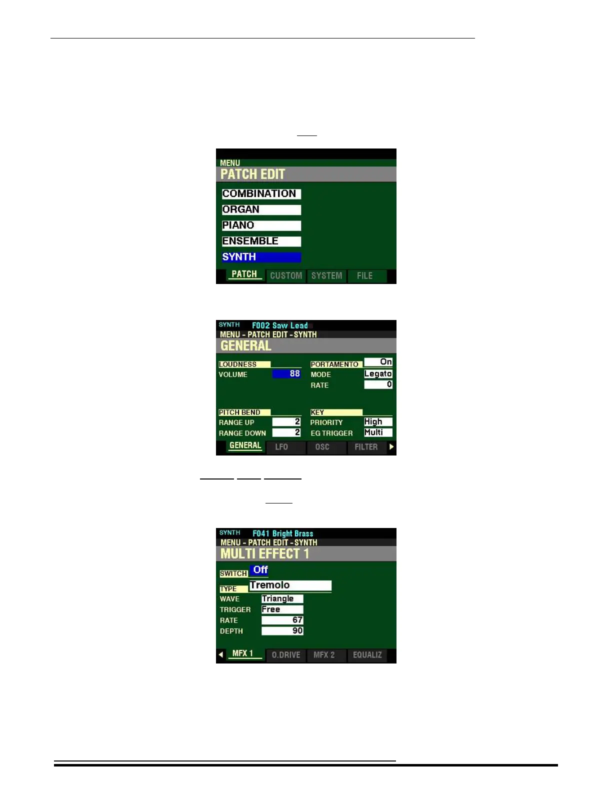 Page 1 of the PATCH EDIT -SYNTH FUNCTION Mode should now display.