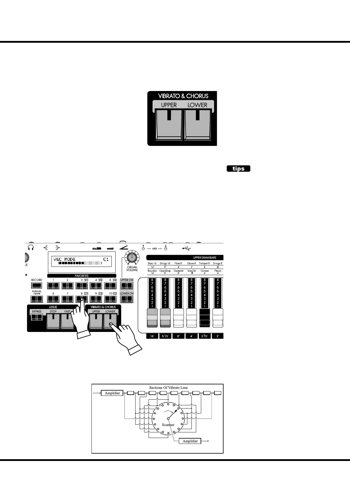 Pressing [UPPER] button “ON” (red LED lit) will turn the Vibrato & Chorus e ect