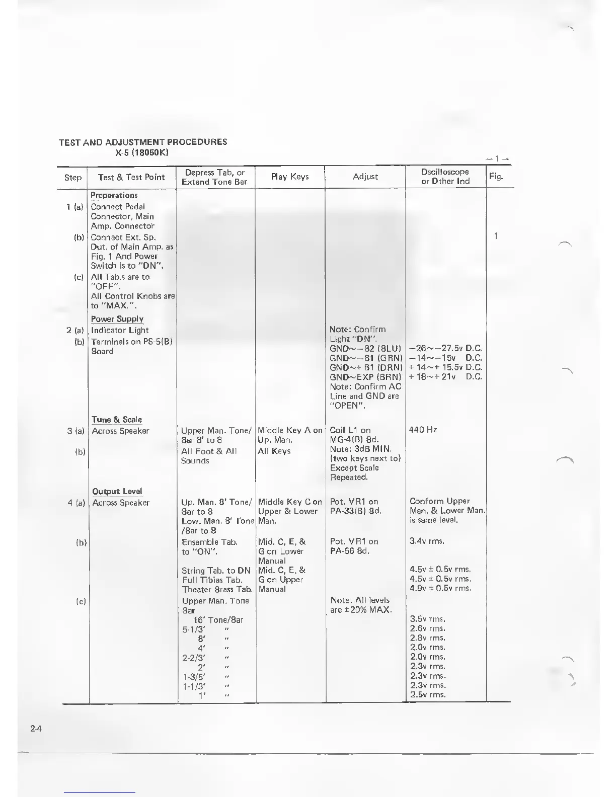 Hammond X-5 - Test and Adjustment Procedures; Initial Setup and Power Checks; Tone and Output Level Testing