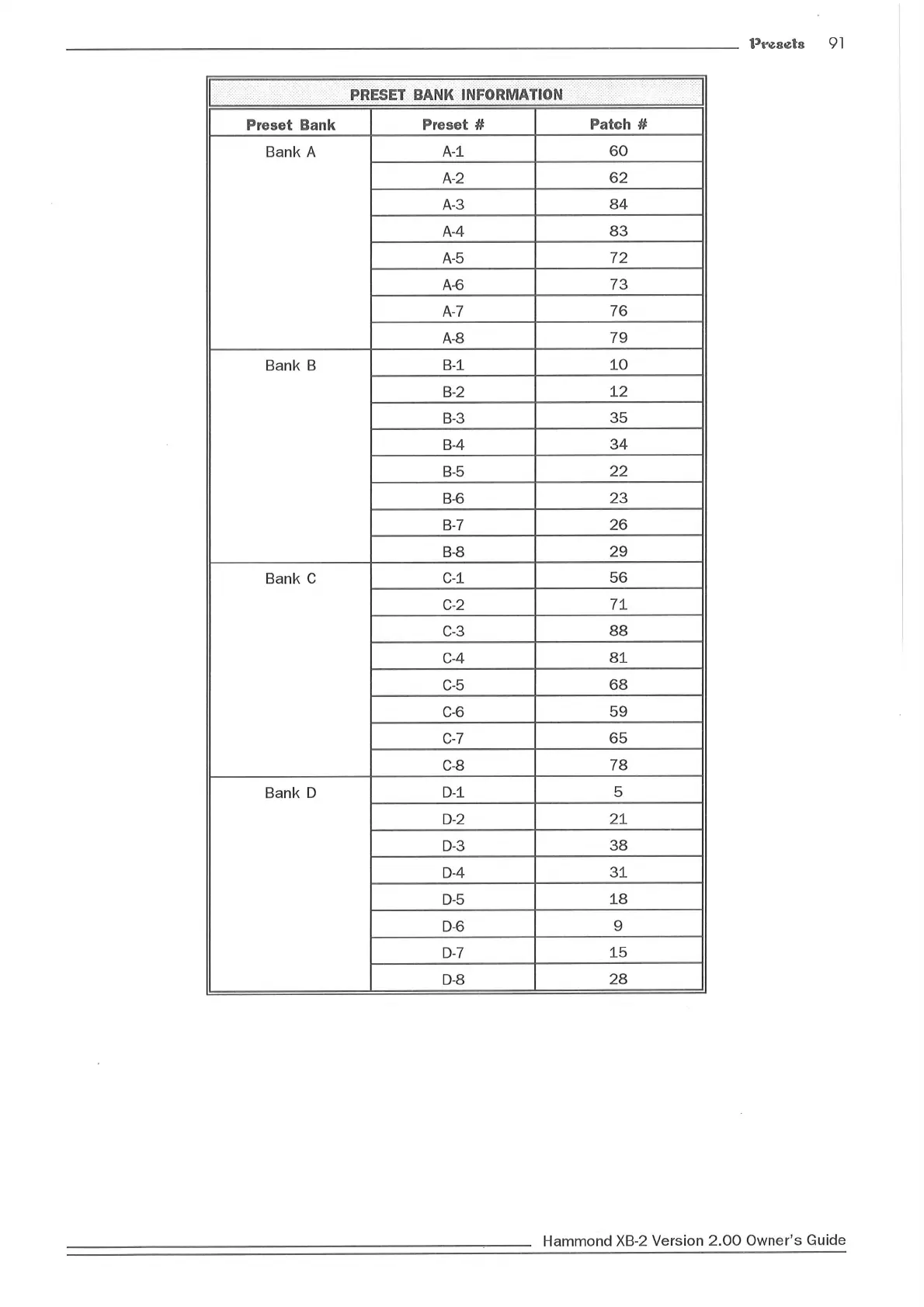 Hammond XB2 - Preset Bank Information