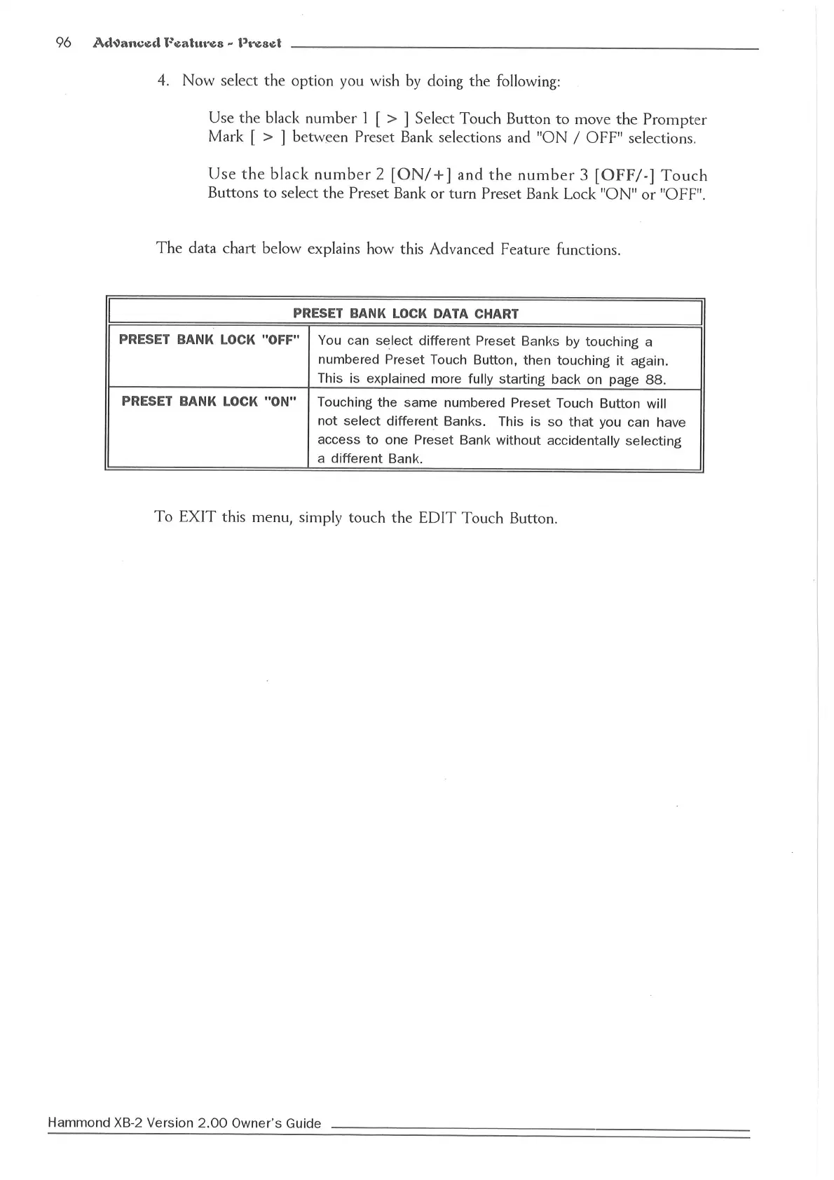 Hammond XB2 - Preset Bank Lock Data Chart