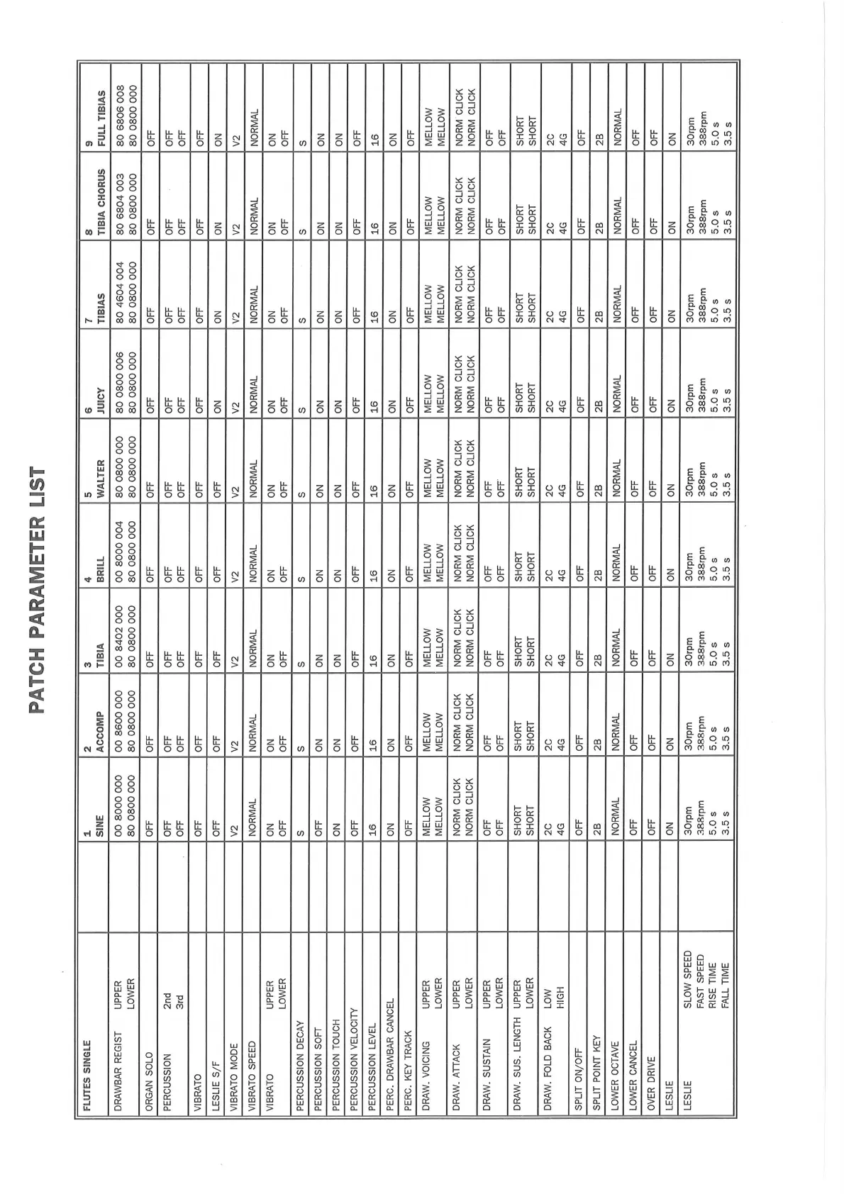 Hammond XB2 - Patch Parameter List