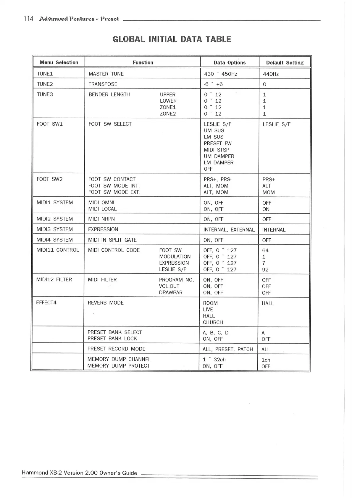 Hammond XB2 - Global Initial Data Table