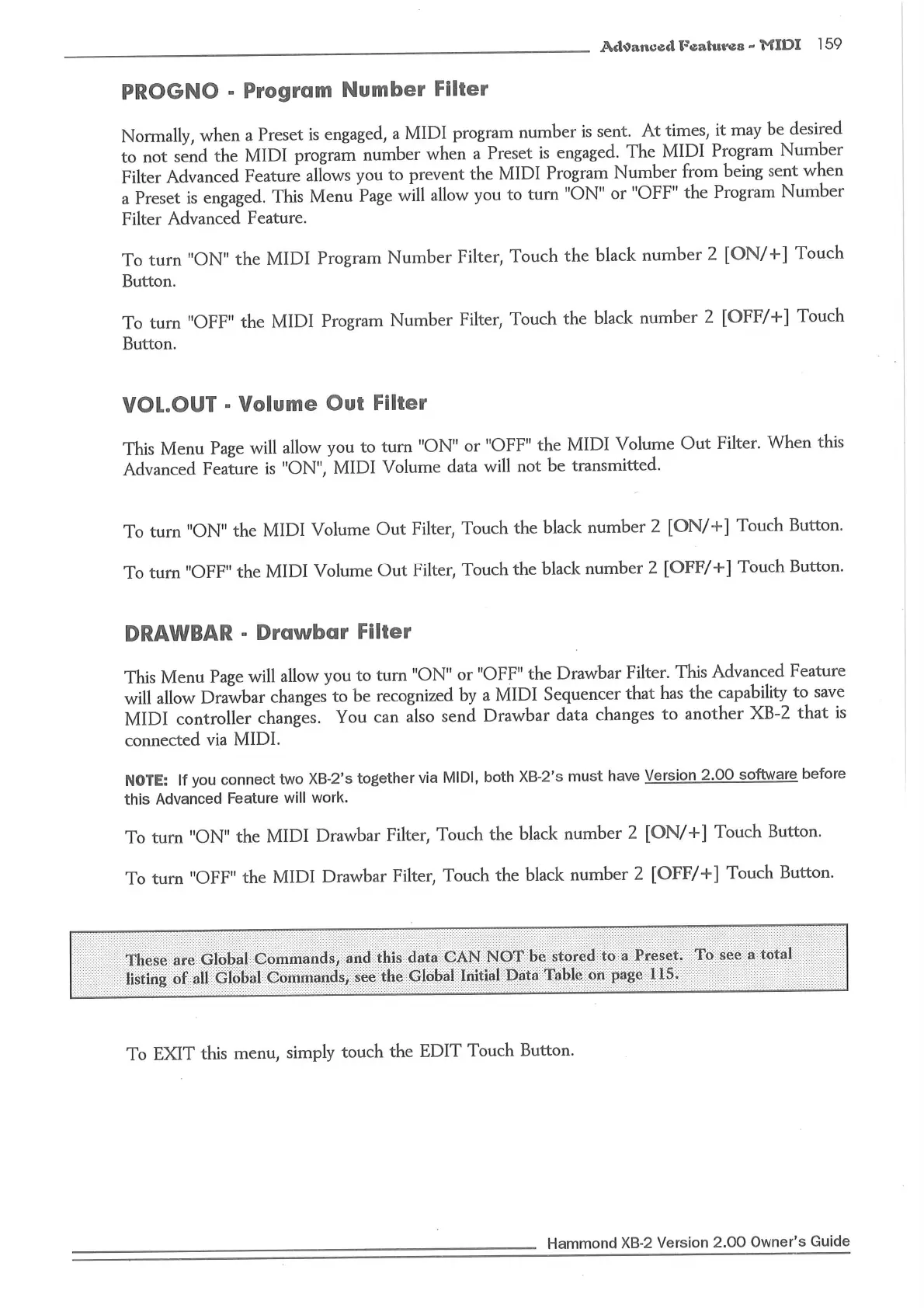 Hammond XB2 - Progno: Program Number Filter; Vol.out: Volume out Filter; Drawbar: Drawbar Filter
