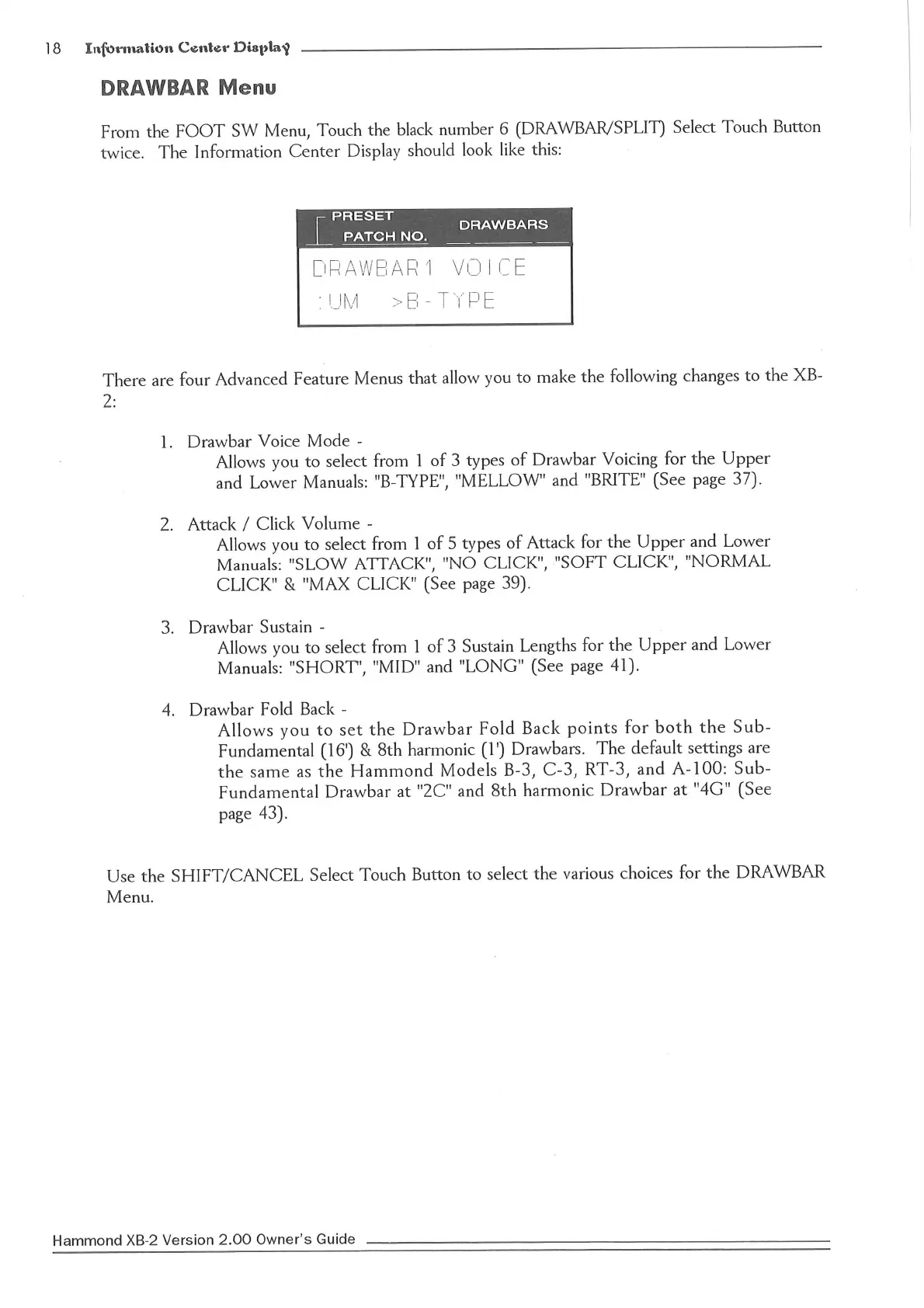 Hammond XB2 - Drawbar Menu