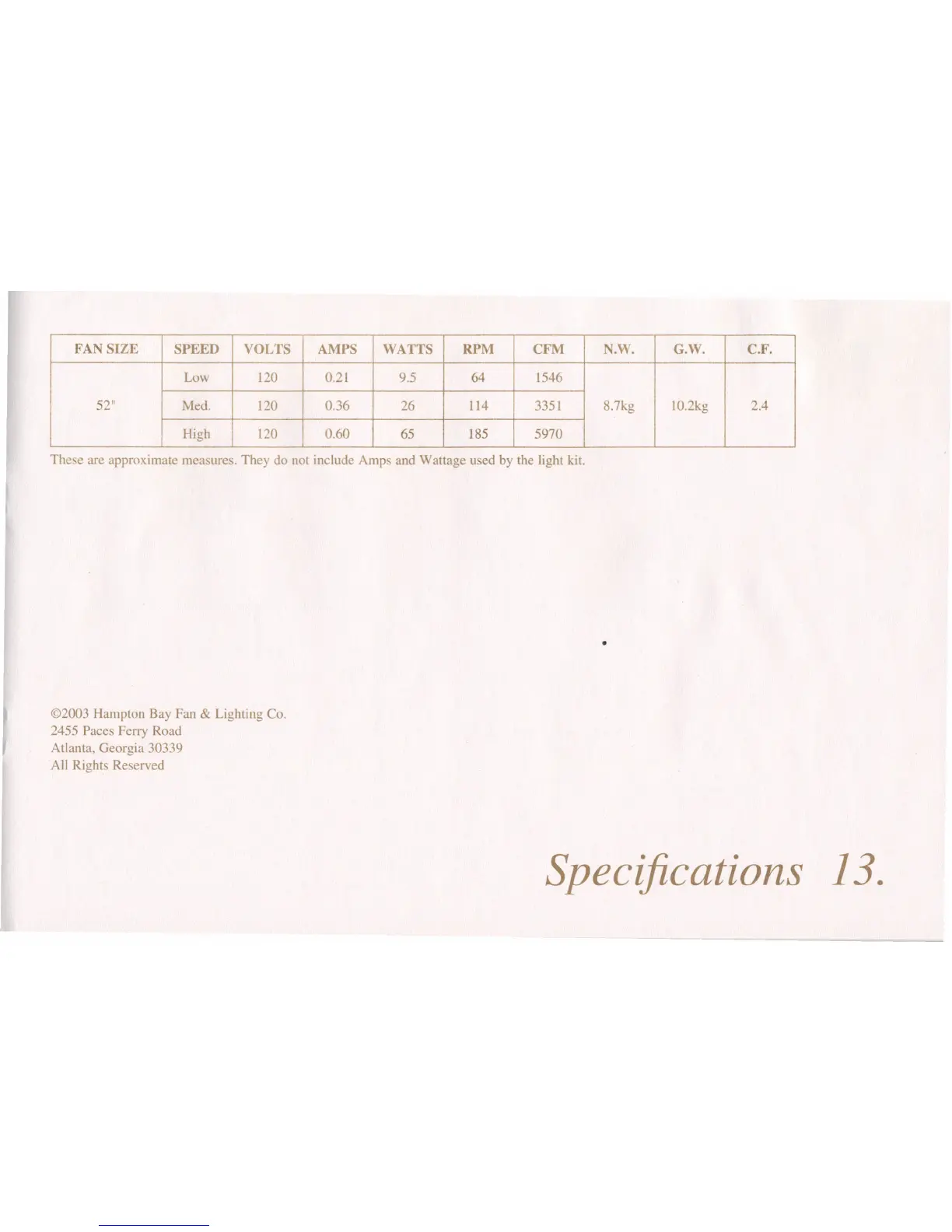 SPEED VOLTS AMPS WATTS RPM CFM N.W. G.W. C.F.