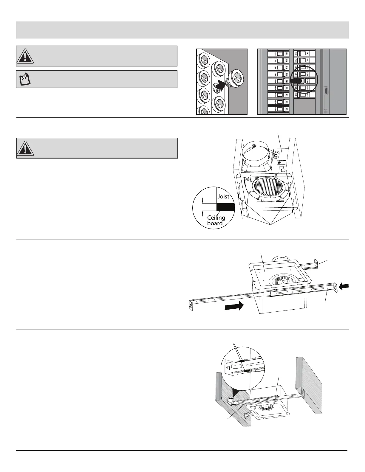Secure the fan housing (A) to the joist with suspension brackets