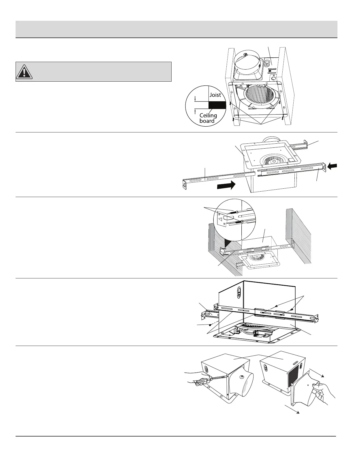 screws (C) to attach the fan housing (A) to the ceiling joist
