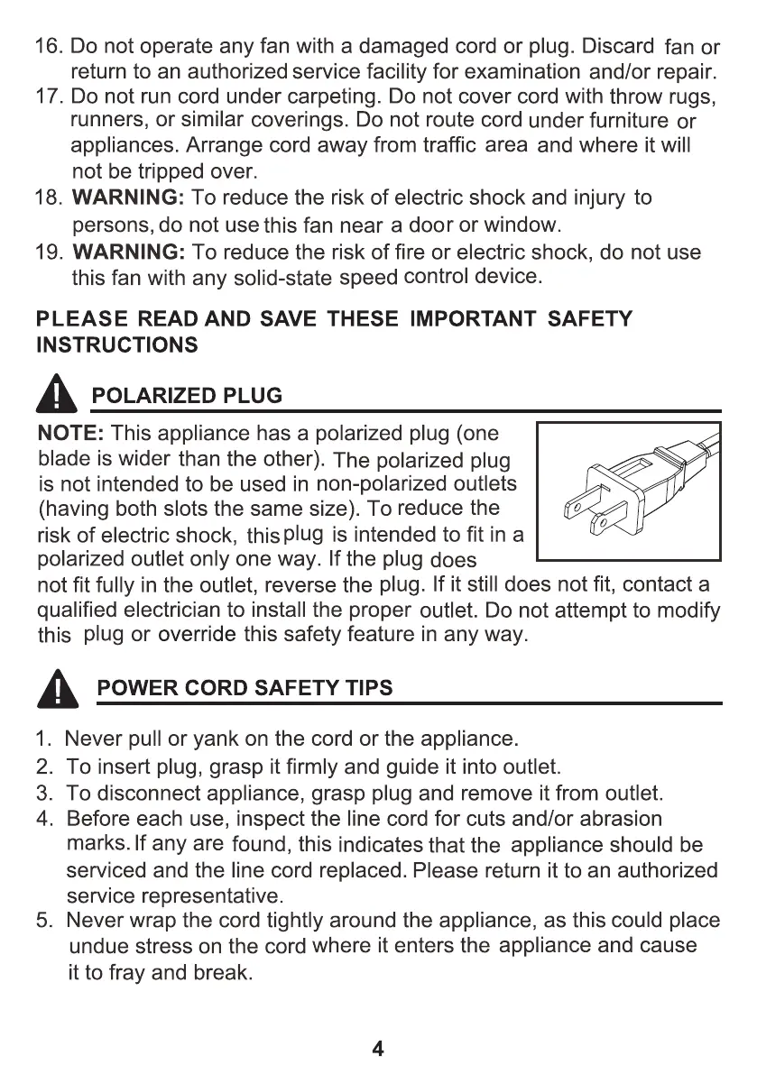 HAMPTON BAY FZ-12A - Polarized Plug Safety; Power Cord Safety Tips