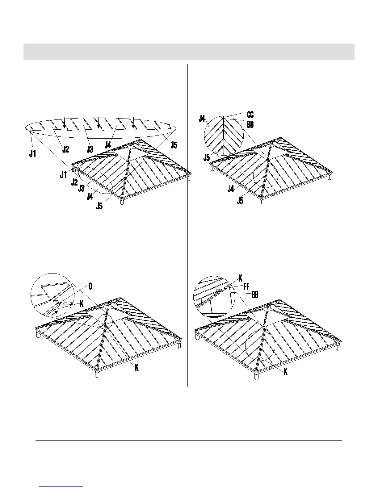 Ƒ Insert one end of the copings (K) to the holes of the small roof