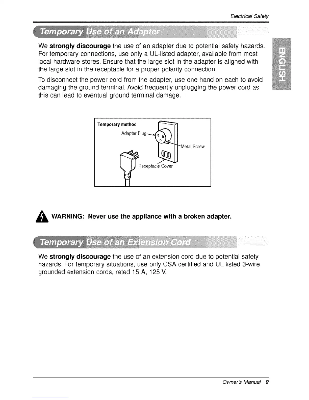 For temporary connect[oins, use only a UL-iisted adapter, availabie from most