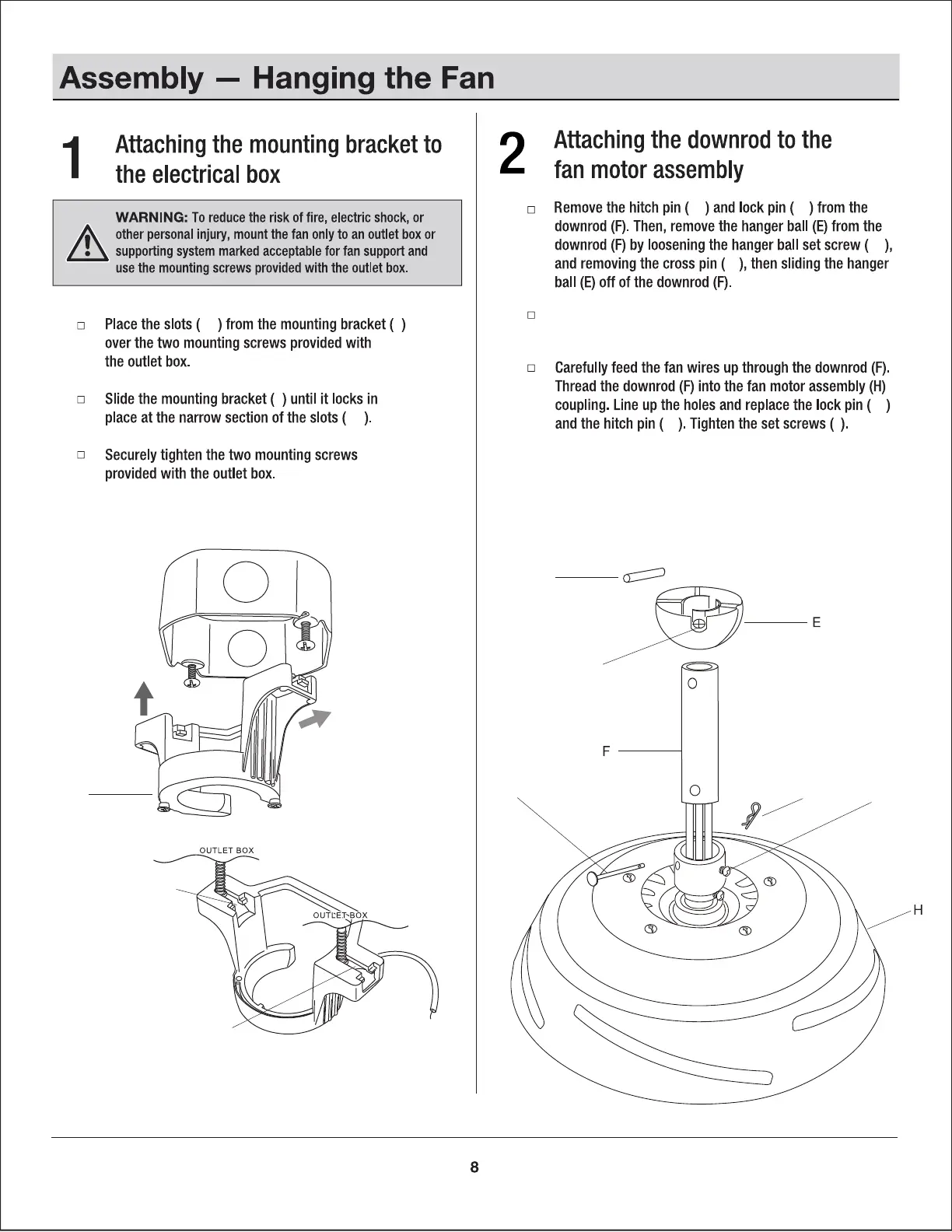 HAMPTON BAY SW20006 ORB - Hanging the Fan Assembly; Bracket and Downrod Attachment