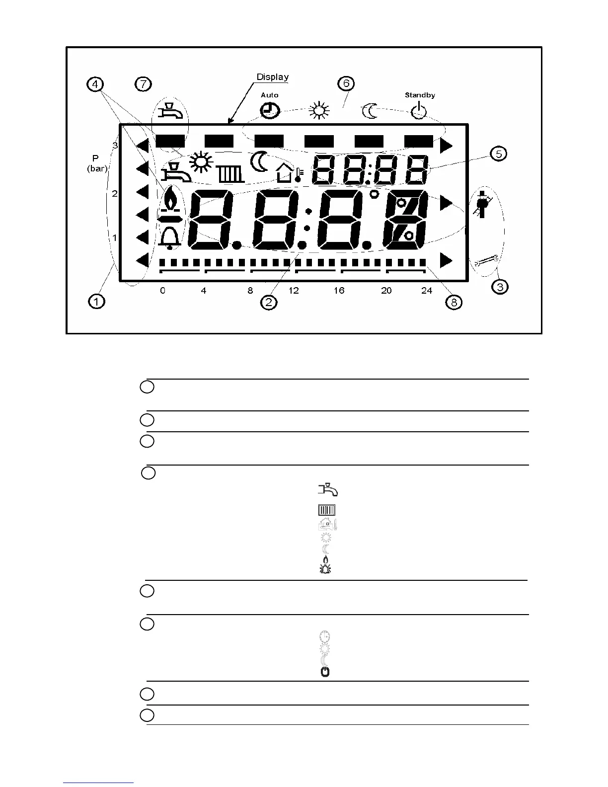 5 Display (1) 4 x 7 small segments Display of time of day, parameter settings