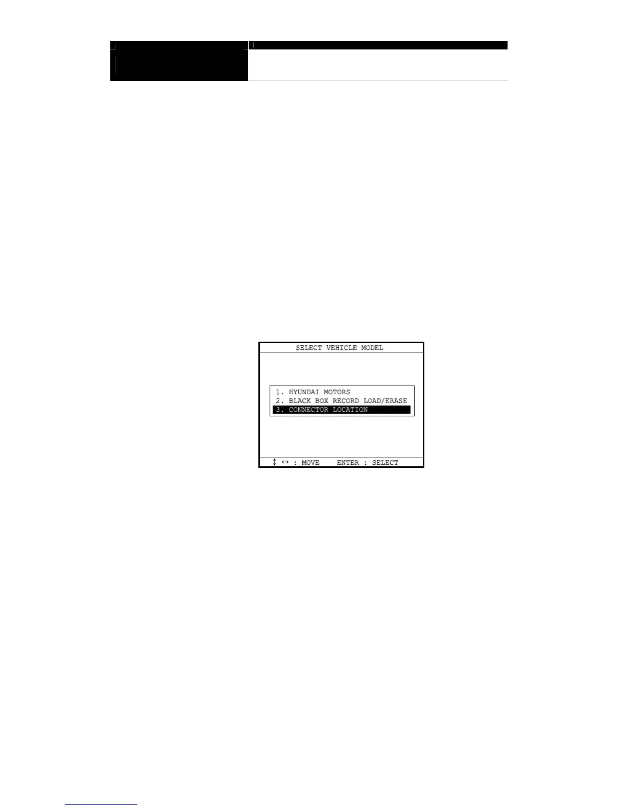 b Select [CONNECTOR LOCATION] from the vehicle selection menu if the