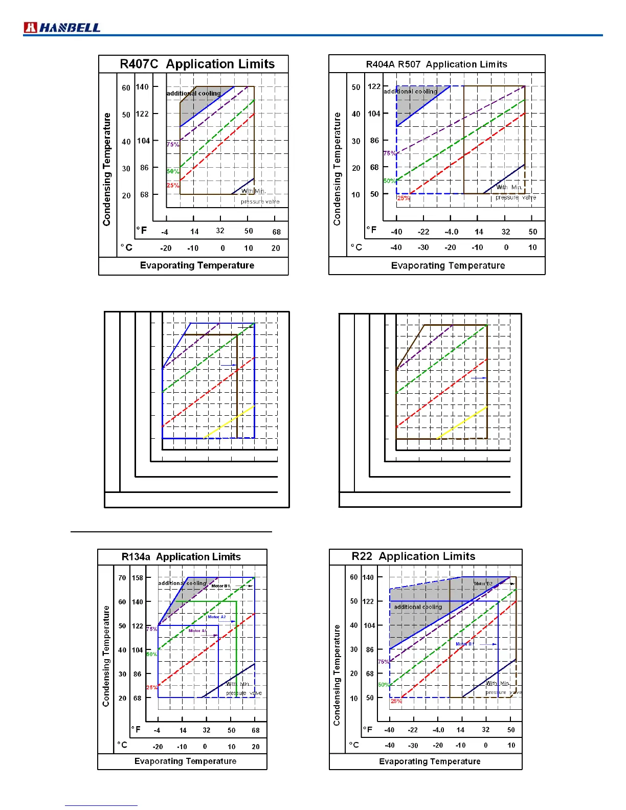 b. Application limits of of RC21020~RC21530 are described on the respective refrigerant charts.