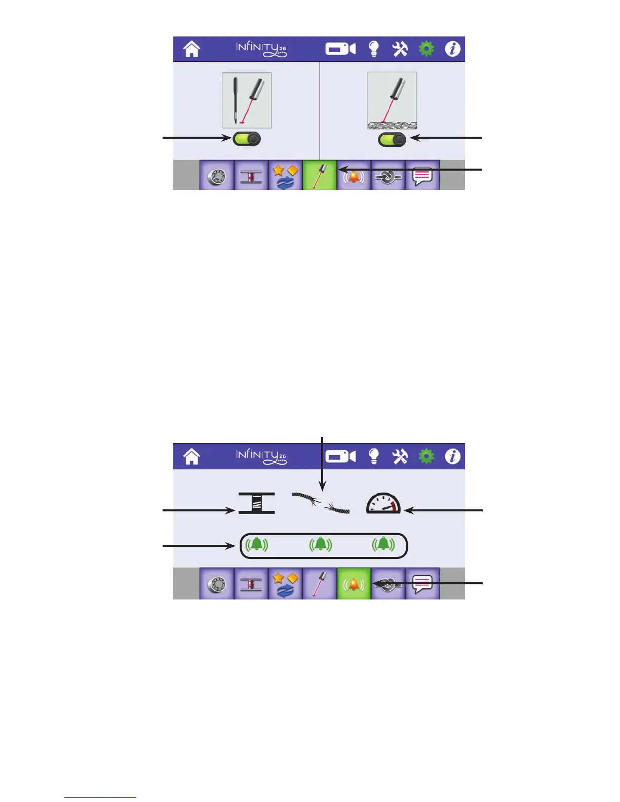 The alarm sengs enable you to quickly turn on or o the alarms for the low bobbin, thread breaks, and