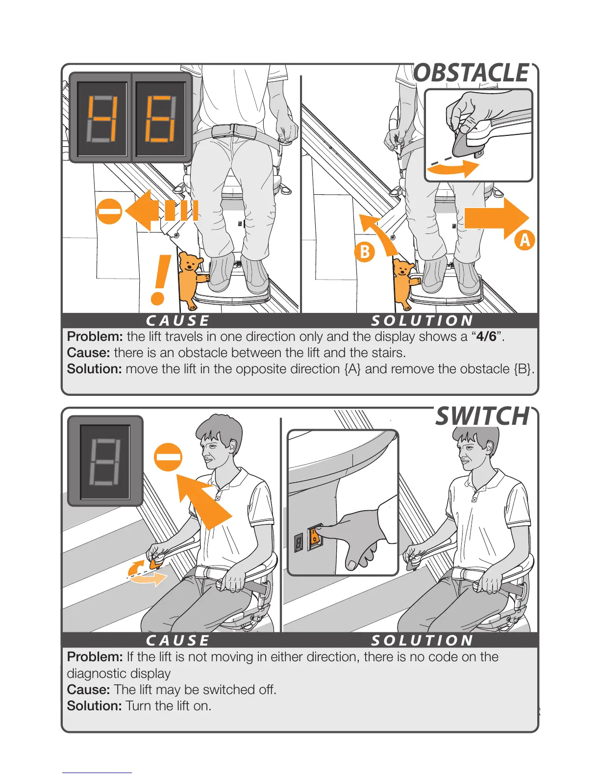 Problem: the lift travels in one direction only and the display shows a “4/6”.