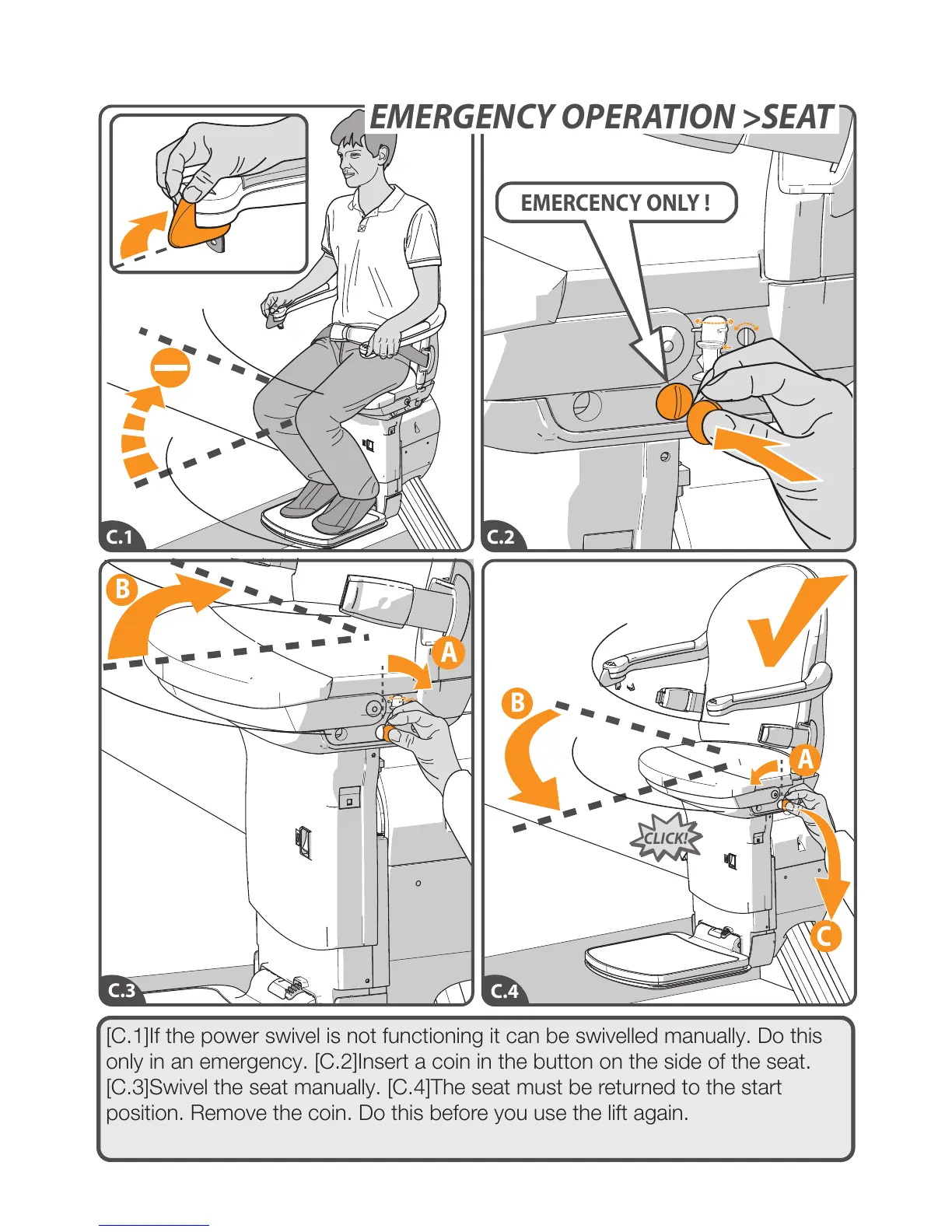 only in an emergency. [C.2]Insert a coin in the button on the side of the seat.