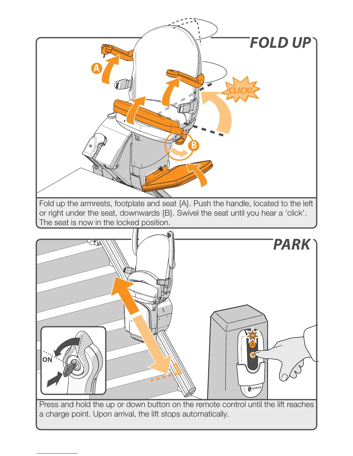 or right under the seat, downwards {B}. Swivel the seat until you hear a 'click'.