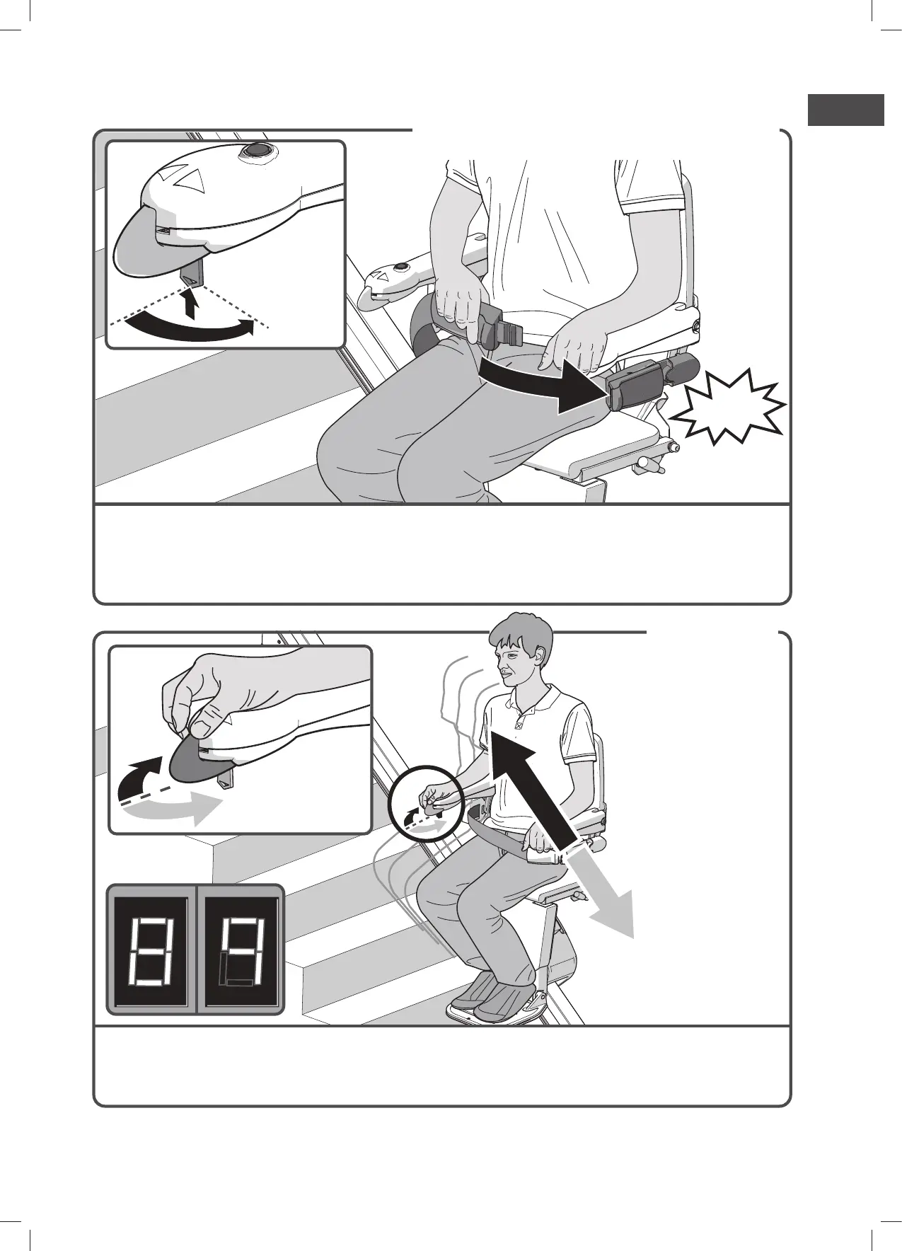 Beweeg en houd de joystick in de gewenste rijrichting. De display laat een ā8/9ā