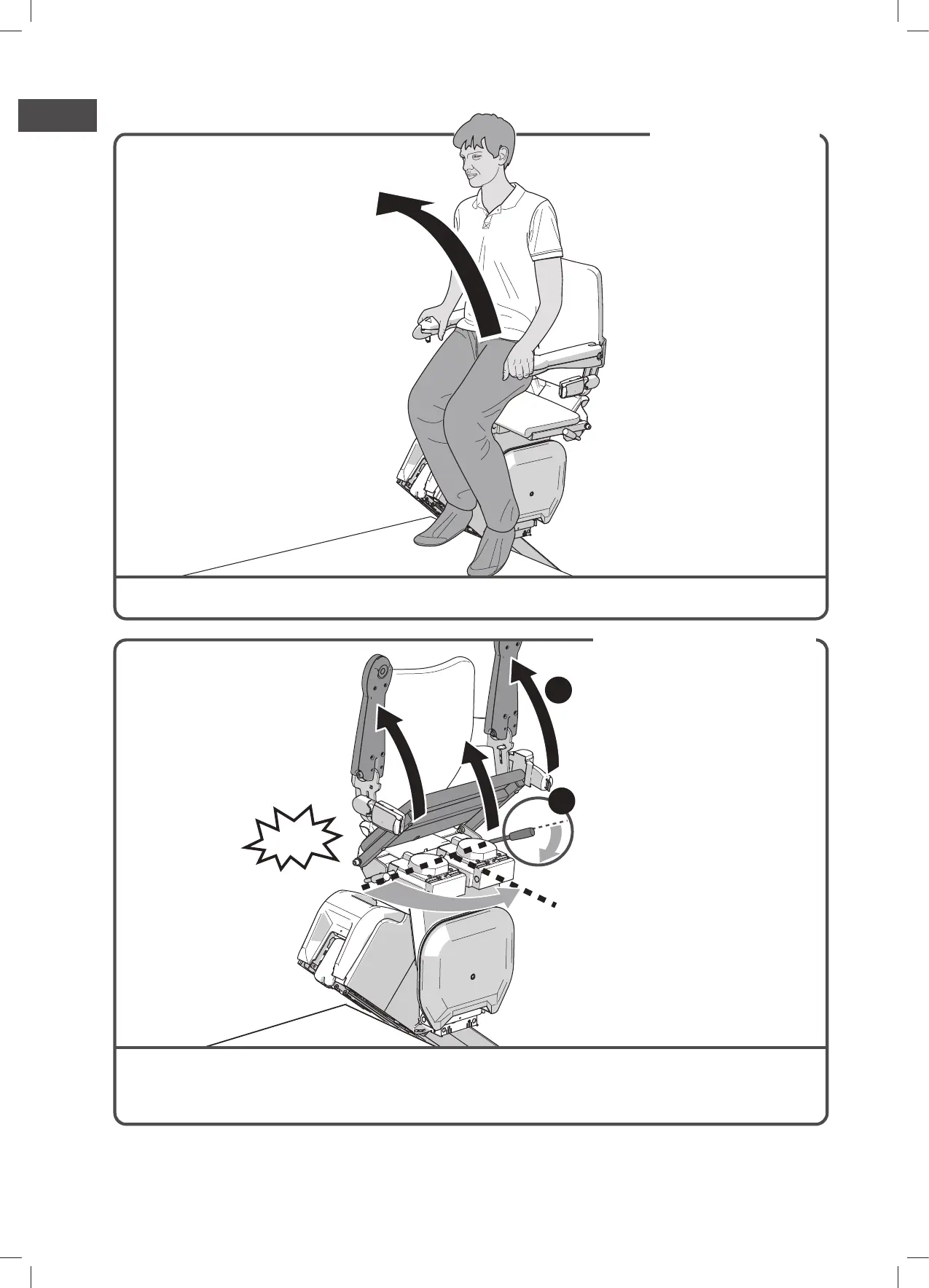 Klap de armleuningen en de stoelzitting op {A}. Druk de hendel links of rechts