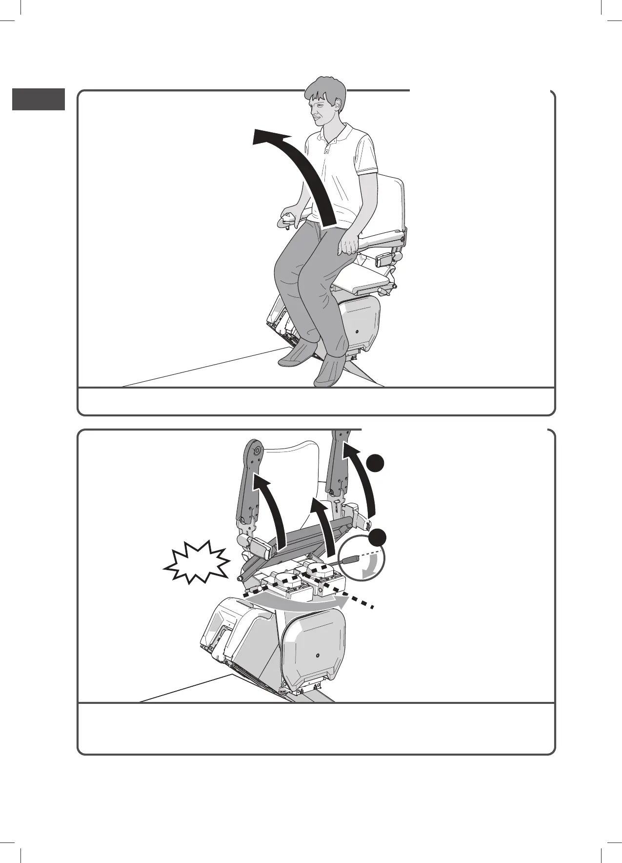 Klappen Sie die Armlehnen und die Sitzfläche nach oben {A}. Drücken Sie den